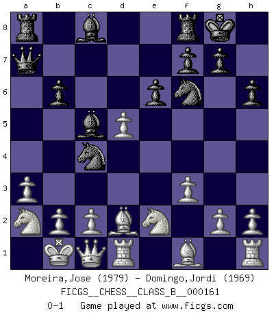 Last move : 0-1 2012 March 11 20:31:10 [Event "FICGS__CHESS__CLASS_B__000161"] [Site "FICGS"] [Date "2011.11.09"] [Round "1"] [White "Moreira,Jose"] [Black "Domingo,Jordi"] [Result "0-1"] [WhiteElo "1979"] [BlackElo "1969"] 1.e4 h6 2.d4 c5 3.dxc5 e6 4.Be3 Nf6 5.f3 Qc7 6.Qd4 Nc6 7.Qd2 b6 8.cxb6 axb6 9.Nc3 Bb4 10.a3 O-O 11.O-O-O d5 12.Kb1 Qa7 13.Nge2 Qa5 14.Qc1 Ne5 15.Na2 Bc5 16.Bd2 Qa7 17.exd5 Nc4 0-1 Carr's defense Kingside Castling by player Black (move 10) Queenside Castling by player White (move 11) Player Black won this chess game. Follow this game move after move (download)Before the endgame, the Gods have placed the middle game. (Siegbert Tarrasch) Um dein Spiel zu verbessern musst du zuallererst das Endspiel studieren, denn diese kann unabhängig studiert werden. Die Eröffnung und das Mittelspiel müssen immer in Bezug gesetzt werden zum Endspiel. (José Raúl Capablanca) Fischer es una tragedia del Ajedrez Americano a la par con Morphy y Pillsbury. (Mig Greengard) Dieu déplace le joueur, et celui-ci la pièce. Quel Dieu derrière Dieu commence donc la trame ? Arturo Perez-Reverte (prix de littérature policière 1993). Control your own destiny or someone else will. (Jack Welch)