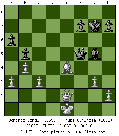 Last move : 1/2-1/2 2012 March 3 20:21:43 [Event "FICGS__CHESS__CLASS_B__000161"] [Site "FICGS"] [Date "2011.11.09"] [Round "1"] [White "Domingo,Jordi"] [Black "Hrubaru,Mircea"] [Result "1/2-1/2"] [WhiteElo "1969"] [BlackElo "1838"] 1.e4 c5 2.Nf3 Nc6 3.d4 cxd4 4.Nxd4 Nf6 5.Nc3 e5 6.Ndb5 d6 7.Bg5 a6 8.Na3 b5 9.Bxf6 gxf6 10.Nd5 f5 11.exf5 Bxf5 12.c3 Be6 13.Nc2 Bh6 14.g3 Bxd5 15.Qxd5 Ne7 16.Qf3 O-O 17.Rd1 d5 18.Nb4 e4 19.Qh5 Qb6 20.Nxd5 Nxd5 21.Rxd5 Rad8 22.Be2 Rxd5 23.Qxd5 e3 24.Rf1 Re8 25.a3 Re6 26.Qf3 Rf6 27.Qa8+ Kg7 28.fxe3 Rxf1+ 29.Kxf1 Bxe3 30.Qe4 Bc1 31.Qc2 Qc6 32.Ke1 Bh6 33.Bd3 Qh1+ 34.Bf1 Qf3 35.Qe2 Qf5 36.Bg2 Bc1 37.b4 Bg5 38.Be4 1/2-1/2 Sicilian : Pelikan (Lasker/Sveshnikov) variation Kingside Castling by player Black (move 16) This chess game ended in a draw. Follow this game move after move (download)In Fischer's hands, a slight theoretical advantage is as good a being a Queen ahead. (Isaac Kashdan) Es ist schade, dass viele Schachsportler vergessen, wie wichtig Auftreten und angemessene Kleidung sind. (Alexandra Kosteniuk) Un mal día en el Ajedrez, es mejor que cualquier buen día en el trabajo. (Anonymous) Ce qui est bien, c'est d'avoir tout un tas de pièces en prise : l'adversaire ne peut en prendre qu'une à la fois. Cité par Thierry Audin. They misunderestimated me. (George W. Bush, Bentonville nov. 6, 2000)