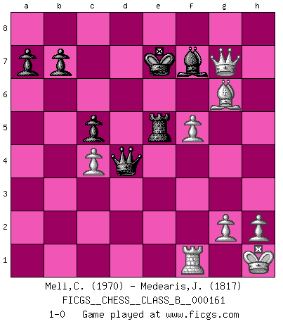 Last move : 1-0 2011 December 6 6:50:37 [Event "FICGS__CHESS__CLASS_B__000161"] [Site "FICGS"] [Date "2011.11.09"] [Round "1"] [White "Meli,Cosimo Leonardo"] [Black "Medearis,John"] [Result "1-0"] [WhiteElo "1970"] [BlackElo "1817"] 1.e4 c5 2.Nf3 Nf6 3.e5 Nd5 4.Nc3 Nxc3 5.dxc3 Nc6 6.Bf4 d5 7.Qd2 e6 8.c4 Be7 9.Rd1 Qb6 10.c3 Qa5 11.cxd5 exd5 12.Qxd5 Be6 13.Qe4 Qxa2 14.Bb5 O-O 15.O-O Rad8 16.Bg5 Rxd1 17.Rxd1 Rd8 18.Re1 Bd5 19.Qh4 Bxg5 20.Nxg5 h6 21.Nxf7 Re8 22.Nxh6+ gxh6 23.Qxh6 Re6 24.Qg5+ Kf8 25.Qf5+ Kg7 26.Bd3 Ne7 27.Qg4+ Kf7 28.c4 Bc6 29.Qf4+ Kg7 30.Qg4+ Kf7 31.Qh5+ Kf8 32.Qh8+ Kf7 33.Be2 Ng6 34.Bh5 Be8 35.f4 Ke7 36.Qg7+ Bf7 37.f5 Rxe5 38.Rf1 Qxb2 39.Bxg6 Qd4+ 40.Kh1 1-0 Sicilian : Nimzovich-Rubinstein variation Kingside Castling by player Black (move 14) Kingside Castling by player White (move 15) Player White won this chess game. Follow this game move after move (download)A man without frontiers. He didn't divide the East and the West, he brought them together in their admiration for him. (Ljubomir Ljubojevic, about Bobby Fischer's death) Privat ist Kortschnoi kein schlechter Mensch, sehr sympathisch. Aber während des Spiels ist er grausam. Er will dich töten. (Miguel Najdorf) EL Ajedrez es como la vida. (Boris Spassky) Les échecs, c'est l'art d'analyser. (Mikhail Botvinnik) As a goal marker shodan is important. As a destination it is a poor place to stop. (Thomas Tamayo)