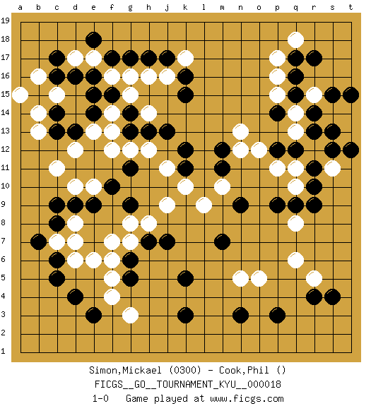 Last move : 1-0 2007 April 5 2:2:7 [Event "FICGS__GO__TOURNAMENT_KYU__000018"] [Site "FICGS"] [Date "2007.01.07"] [Round "1"] [Black "Simon,Mickael"] [White "Cook,Phil"] [Result "1-0"] [Rating 1 "0300"] 1.r17 e17 2.r4 c15 3.d4 p15 4.q15 p17 5.r10 q13 6.r13 q14 7.r14 r15 8.q16 p16 9.q17 k17 10.p3 d10 11.k3 r12 12.s15 q18 13.k15 s14 14.s13 t14 15.t15 t13 16.s12 s11 17.t12 q10 18.r9 q6 19.q9 q8 20.p9 q11 21.n9 e6 22.c6 f4 23.e3 g3 24.k5 o5 25.n3 n5 26.c9 c11 27.k12 k10 28.m11 n12 29.m12 n13 30.g5 f5 31.g6 d6 32.c5 d8 33.c8 c7 34.b7 d7 35.d9 f7 36.e9 f6 37.g9 g7 38.h7 h8 39.j7 j9 40.c13 d12 41.d13 e10 42.f10 g8 43.g11 f12 44.d16 d15 45.e16 e13 46.e14 f14 47.e15 f16 48.f15 g15 49.g14 f13 50.f17 g16 51.e18 d17 52.c17 h14 53.g13 g12 54.h13 h12 55.j13 j11 56.k11 l9 57.m7 m10 58.g17 h16 59.j17 j16 60.k16 d14 61.c16 b16 62.b15 r5 63.s4 b14 64.c14 b13 65.h17 a15 66.r11 c15 67.q12 p11 68.p12 o12 69.p14 1-0 Here are the names of the openings (joseki) played in the four corners : Corner q16 : r17 p15 San-San (Sam-Sam, San-San) 3-3 Point. The San-San (3-3) point, emphasizing territory at the expense of influence. Corner d4 : d4 e6 Hoshi (Hwajeom, Seongjeom, Xingwei`) 4-4 Point. The star or hoshi (4-4) point, emphasizing influence at the potential expense of territory. Player Black won this Go (weiqi, baduk) game. Follow this game move after move (download)In opponents' sphere of influence, avoid sharp conflict, don't move too deep. (Otake Hideo, 9p) Computers have lots of memory but no imagination. (Anonymous)