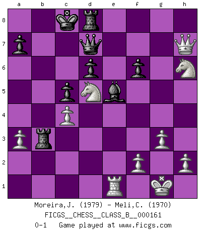 Last move : 0-1 2012 February 25 7:54:1 [Event "FICGS__CHESS__CLASS_B__000161"] [Site "FICGS"] [Date "2011.11.09"] [Round "1"] [White "Moreira,Jose"] [Black "Meli,Cosimo Leonardo"] [Result "0-1"] [WhiteElo "1979"] [BlackElo "1970"] 1.e4 c5 2.Nf3 d6 3.Bb5+ Bd7 4.Bxd7+ Qxd7 5.O-O Nc6 6.c3 Nf6 7.d4 Nxe4 8.d5 Nb8 9.Re1 Nf6 10.Bg5 Na6 11.c4 h6 12.Bxf6 gxf6 13.Nc3 O-O-O 14.Nh4 Rg8 15.Qc2 Nb4 16.Qh7 Rg7 17.Qb1 e6 18.a3 Na6 19.Qd3 f5 20.g3 Be7 21.Ng2 Bf6 22.b4 exd5 23.Nxd5 Bxa1 24.b5 Be5 25.bxa6 f6 26.Nh4 Qa4 27.Nxf5 Rgd7 28.axb7+ Rxb7 29.Nxh6 Rb3 30.Qh7 Qd7 0-1 Sicilian : Canal-Sokolsky attack, Bronstein gambit Kingside Castling by player White (move 5) Queenside Castling by player Black (move 13) Player Black won this chess game. Follow this game move after move (download)Your body has to be in top condition. Your Chess deteriorates as your body does. You can't separate body from mind. (Bobby Fischer) Wenn du gegen Bobby spielst, ist es keine Frage von gewinnen oder verlieren. Es ist eine Frage des Überlebens. (Boris Vassilievich Spassky) Existen dos clases de sacrificios: los correctos y los míos. (Mikhail Tal) On n'a jamais que l'âge auquel on a commence à jouer aux échecs car après on cesse de vieillir. (Capablanca) Perseverance does not equal worthiness. Next time you want to get my attention, wear something fun. Low-riding jeans are hot. (Gregory House, House M.D.)