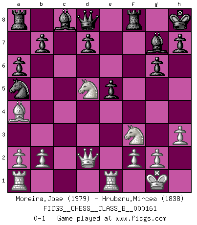 Last move : 0-1 2012 February 28 8:0:22 [Event "FICGS__CHESS__CLASS_B__000161"] [Site "FICGS"] [Date "2011.11.09"] [Round "1"] [White "Moreira,Jose"] [Black "Hrubaru,Mircea"] [Result "0-1"] [WhiteElo "1979"] [BlackElo "1838"] 1.e4 c5 2.Nf3 Nc6 3.Bb5 g6 4.O-O Bg7 5.c3 Nf6 6.Re1 O-O 7.h3 e5 8.d4 cxd4 9.cxd4 exd4 10.e5 Nd5 11.Bg5 Qc7 12.Qb3 Nb6 13.Bf4 Na5 14.Qb4 Nd5 15.Qxd4 Nxf4 16.Qxf4 f6 17.Nc3 fxe5 18.Qd2 a6 19.Ba4 Kh8 20.Nd5 Qd8 0-1 Sicilian : Nimzovich-Rossolimo attack (with ...g6, without ...d6) Kingside Castling by player White (move 4) Kingside Castling by player Black (move 6) Player Black won this chess game. Follow this game move after move (download)Tactics flow from a superior position. (Bobby Fischer) Immer nach dem besten Zug zu suchen ist ziemlich unpraktisch. (Nigel Short) Un buen sacrificio es aquel que aunque no sea necesariamente sólido, deja a tu oponente aturdido y confuso. (Rudolph Spielmann) Un millionnaire : 'Monsieur Steinitz ! Vous ne participez aux tournois que pour l'argent, alors que moi je n'y viens que pour l'honneur.' Steinitz : 'Chacun joue pour ce qu'il n'a pas'... Wipe them out. All of them. (Darth Sidious in Star Wars ep.1)