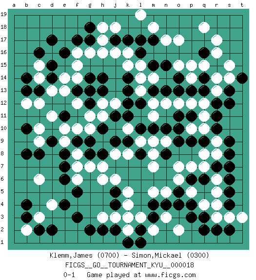 Last move : 0-1 2007 May 29 0:12:43 [Event "FICGS__GO__TOURNAMENT_KYU__000018"] [Site "FICGS"] [Date "2007.01.07"] [Round "1"] [Black "Klemm,James"] [White "Simon,Mickael"] [Result "0-1"] [Rating 1 "0700"] [Rating 2 "0300"] 1.q16 d4 2.q3 r5 3.d17 c15 4.f3 c6 5.p4 q7 6.e16 d13 7.r11 k3 8.s8 s3 9.m3 k5 10.f5 m5 11.j4 k4 12.p6 p7 13.q6 r6 14.r7 o6 15.o5 o7 16.n4 n5 17.l2 o17 18.s6 r3 19.s5 q4 20.q2 p5 21.o4 q18 22.j2 r17 23.l17 r16 24.c16 r13 25.d15 c14 26.d14 e13 27.c13 c12 28.b13 b12 29.b14 f15 30.g17 k16 31.k17 j16 32.j17 h16 33.h8 k8 34.p11 q10 35.r10 r8 36.s7 r9 37.s9 q11 38.l16 l15 39.e11 d11 40.d2 c3 41.r12 q12 42.q13 r14 43.q14 p12 44.o14 n12 45.m15 l14 46.n15 h6 47.j5 j6 48.c8 c9 49.d9 c10 50.b8 e9 51.f9 e10 52.e8 f10 53.g9 g10 54.h10 h11 55.k9 f6 56.e6 f7 57.e7 f8 58.e4 j3 59.h2 h3 60.g8 h7 61.j11 j8 62.j9 h12 63.k11 k10 64.l10 g7 65.l8 m9 66.m10 m12 67.o11 o12 68.n8 n9 69.o9 m8 70.n10 m7 71.l12 l9 72.k13 j12 73.c2 b2 74.b4 h17 75.g18 n17 76.m17 k2 77.m13 l13 78.k12 m11 79.q9 q8 80.p9 p10 81.o10 h18 82.g2 q15 83.o13 p15 84.k14 k15 85.h14 f16 86.h13 g16 87.f17 f14 88.g12 g11 89.f13 g13 90.g14 f12 91.g13 e14 92.s4 r4 93.s2 t3 94.s13 s14 95.s12 l19 96.b3 m18 97.k1 m14 98.n13 l3 99.t14 s15 100.b10 m2 101.l1 n3 102.m4 o2 103.p3 j18 104.r2 p14 105.p13 o15 0-1 Here are the names of the openings (joseki) played in the four corners : Corner q4 : q3 r5 Komoku (Somok, Xiao~mu`) 3-4 Point. The komoku (3-4) point is the traditional corner enclosure move.. Ikken Kakari (Hankan Keolch'im, Yi Gua`jiao~, 1-Space Low Pincer). The small knight move is the basic approach move to the 3-4 point stone. It has been continually used for over four centuries. There are limitless variations, with new moves constantly being discovered. White 2 opens the door to a treaure store of joseki. Corner d16 : d17 c15 Komoku (Somok, Xiao~mu`) 3-4 Point. The komoku (3-4) point is the traditional corner enclosure move.. Ikken Kakari (Hankan Keolch'im, Yi Gua`jiao~, 1-Space Low Pincer). The small knight move is the basic approach move to the 3-4 point stone. It has been continually used for over four centuries. There are limitless variations, with new moves constantly being discovered. White 2 opens the door to a treaure store of joseki. Corner d4 : d4 f3 Hoshi (Hwajeom, Seongjeom, Xingwei`) 4-4 Point. The star or hoshi (4-4) point, emphasizing influence at the potential expense of territory. Ikken Kakari (Hankan Keolch'im, Yi Gua`jiao~, 1-Space Low Approach). Black 2 is the standard approach move to the 4-4. Player White won this Go (weiqi, baduk) game. Follow this game move after move (download)Each step in a ladder is worth 7 points. (Anonymous) He who laughs last probably does not get the joke. (Unknown)