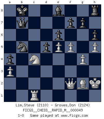 Last move : 1-0 2012 February 10 6:36:27 [Event "FICGS__CHESS__RAPID_M__000049"] [Site "FICGS"] [Date "2011.11.10"] [Round "1"] [White "Lim,Steve"] [Black "Groves,Don"] [Result "1-0"] [WhiteElo "2110"] [BlackElo "2124"] 1.e4 e6 2.d4 d5 3.Nc3 Nf6 4.Bg5 Be7 5.e5 Nfd7 6.h4 h6 7.Bxe7 Qxe7 8.Qd2 a6 9.f4 c5 10.Nf3 b5 11.g4 Nb6 12.Qf2 c4 13.a3 Nc6 14.h5 Rb8 15.Bg2 Bd7 16.O-O Rb7 17.Rae1 Kd8 18.Nd1 Kc8 19.Ne3 Kb8 20.f5 Be8 21.c3 Na4 22.Re2 a5 23.Ra1 Ra7 24.Rc2 b4 25.R2c1 bxc3 26.bxc3 Rb7 27.Nd2 Nb6 28.Rcb1 a4 29.Rb5 Nxd4 30.Rb4 Nb5 31.Ndxc4 Nxc4 32.Nxc4 Nxc3 33.Rxb7+ Qxb7 34.Kh2 Nb5 35.Rc1 1-0 French : Albin-Alekhine-Chatard attack Kingside Castling by player White (move 16) Player White won this chess game. Follow this game move after move (download)The passion for playing Chess is one of the most unaccountable in the world. (H.G. Wells) Ich verlor meine Bürgerrechte, mein Gehalt wurde mir nicht mehr bezahlt und ich wurde zensiert und durfte nicht mehr ins Ausland reisen. [nach dem Match Fischer-Taimanov 6:0] (Mark Taimanov) Yo considero que Fischer es uno de los expertos mas grandes de aperturas de siempre. (Keith Hayward) Ne tendez aucun piège pour le plaisir ! Ne jouez rien dans l'espoir que l'adversaire réagisse de façon stupide ! Prenez toujours pour acquis que l'adversaire va trouver le meilleur coup ! Ne jouez jamais de coup dans l'espoir que l'adversaire ne voie pas la menace ! Chacun de vos coups doit améliorer la position d'une façon ou d'une autre. It is a good thing for an uneducated man to read books of quotations. (Winston Churchill)