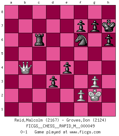Last move : 0-1 2011 December 30 18:7:27 [Event "FICGS__CHESS__RAPID_M__000049"] [Site "FICGS"] [Date "2011.11.10"] [Round "1"] [White "Reid,Malcolm"] [Black "Groves,Don"] [Result "0-1"] [WhiteElo "2167"] [BlackElo "2124"] 1.e4 e6 2.b3 d5 3.Bb2 dxe4 4.Nc3 Nf6 5.Qe2 Be7 6.O-O-O a5 7.a4 b6 8.d3 Ba6 9.Nxe4 O-O 10.Qf3 Nbd7 11.Ne2 c6 12.Nd4 Bb7 13.Be2 b5 14.h4 bxa4 15.bxa4 Rb8 16.h5 Qb6 17.Qg3 h6 18.Nb3 c5 19.Ned2 Bd5 20.Nc4 Qb4 21.Rh4 Qxa4 22.Kd2 Bxc4 23.Ra1 Qb4+ 24.Bc3 Qxc3+ 25.Kxc3 Nd5+ 26.Kd2 Bxb3 27.cxb3 Bxh4 28.Qxh4 Rxb3 29.Ke1 Rb4 30.Qg3 Nf4 31.d4 Nxe2 32.Kxe2 cxd4 33.Rxa5 Rb2+ 34.Kf1 Rfb8 35.Ra1 Nf6 36.Rd1 R8b5 37.Qa3 e5 38.Qd3 Nxh5 39.g3 Nf6 40.Qf5 Rc5 41.Ra1 Rb8 42.Qd3 Rd8 43.Ra7 e4 44.Qb1 d3 45.Qb7 Rf8 46.Ra2 Kh7 47.Kg2 Rd8 48.Qb4 Rdc8 49.Ra6 R5c6 50.Rxc6 Rxc6 0-1 Scott Nichols Nice Queen sac by Black! Ilmar Ambos Interesting variation,must look this game!! French : Reti (Spielmann) variation Queenside Castling by player White (move 6) Kingside Castling by player Black (move 9) Player Black won this chess game. Follow this game move after move (download)I play correspondence chess because it is both art and science while chess is art only. (A player at FICGS) Es hat in meinem Leben Zeiten gegeben, da ich sehr nahe daran war zu glauben, daß ich auch nicht eine einzige Schachpartie verlieren könnte. (José Raúl Capablanca) Yo adoro todas la posiciones. Denme una partida posicional difícil, y la jugaré. Pero posiciones totalmente ganadas, no las tolero. (Hein Donner) Il vaut toujours mieux jouer un plan faux de façon logique que de n'avoir pas de plan du tout. (Victor Kortchnoï) Man is still the most extraordinary computer of all. (John F. Kennedy)