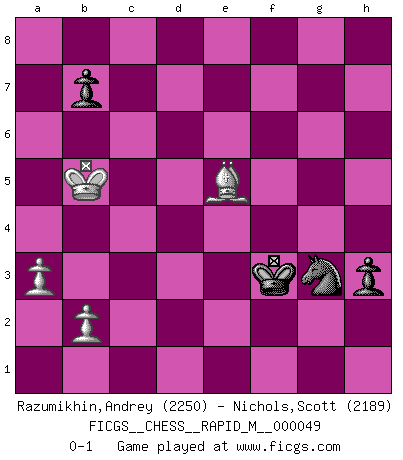 Last move : 0-1 2012 March 11 19:29:28 [Event "FICGS__CHESS__RAPID_M__000049"] [Site "FICGS"] [Date "2011.11.10"] [Round "1"] [White "Razumikhin,Andrey"] [Black "Nichols,Scott"] [Result "0-1"] [WhiteElo "2250"] [BlackElo "2189"] 1.e4 c5 2.Nf3 d6 3.d4 cxd4 4.Nxd4 Nf6 5.Nc3 a6 6.Be3 e5 7.Nb3 Be6 8.f3 h5 9.Nd5 Bxd5 10.exd5 Nbd7 11.Qd2 g6 12.O-O-O Qc7 13.Kb1 Be7 14.f4 exf4 15.Bxf4 O-O 16.h3 Rfe8 17.g4 Bf8 18.Qg2 Bg7 19.Be2 h4 20.c3 Nb6 21.Bf3 a5 22.Nd4 a4 23.a3 Nc4 24.Bc1 Qb6 25.Ka1 Nd7 26.Be4 Nc5 27.Bc2 Nb3+ 28.Bxb3 axb3 29.Rhf1 Bh6 30.Qf2 f5 31.g5 Bg7 32.Rfe1 Bxd4 33.cxd4 Qb5 34.Re6 Rxe6 35.dxe6 Qd5 36.Re1 Re8 37.Qxh4 Rxe6 38.Rxe6 Qxe6 39.Qg3 Na5 40.Qe3 Qxe3 41.Bxe3 Nc4 42.Bf4 Kf7 43.Kb1 Ke6 44.Kc1 Nb6 45.Bd2 Kd5 46.h4 Nc8 47.Ba5 Ne7 48.Bd8 Nc6 49.Bb6 f4 50.h5 gxh5 51.g6 Ne7 52.g7 Ke6 53.Bd8 Ng8 54.Kd2 Kf7 55.Bg5 f3 56.Ke3 Kxg7 57.Kxf3 Kg6 58.Kf4 Nf6 59.Bh4 Nd5+ 60.Ke4 Nb6 61.Kd3 Kf5 62.d5 Nxd5 63.Bg3 Kg4 64.Bxd6 Kf3 65.Kc4 Ne3+ 66.Kxb3 h4 67.Kb4 h3 68.Kb5 Nf5 69.Be5 Ng3 0-1 Sicilian : Najdorf, Byrne (English) attack Queenside Castling by player White (move 12) Kingside Castling by player Black (move 15) 10 pieces endgame at move 62 : White KBPP , Black KNPPPP WHITE : King + 1 Bishop 2 Pawns BLACK : King + 1 Knight 4 Pawns 9 pieces endgame at move 64 : White KBPP , Black KNPPP WHITE : King + 1 Bishop 2 Pawns BLACK : King + 1 Knight 3 Pawns 8 pieces endgame at move 66 : White KBPP , Black KNPP WHITE : King + 1 Bishop 2 Pawns BLACK : King + 1 Knight 2 Pawns Player Black won this chess game. Follow this game move after move (download)When your house is on fire, you can't be bothered with the neighbors. Or, as we say in Chess, if your King is under attack you don't worry about losing a Pawn on the Queen's side. (Gary Kasparov) Im Blitz ist es einfacher mit einer Figur weniger anzugreifen, als sich mit einer Mehrfigur zu verteidigen. (Mikhail Nekhemyevich Tal) Los finales de Peón son del Ajedrez lo que el cesped es del Golf. (Cecil Purdy) À la honte des hommes, on sait que les lois du jeu sont les seules qui soient partout justes, claires, inviolables et exécutées. Pourquoi l'Indien qui a donné les règles du jeu d'échecs est-il obéi de bon gré dans toute la terre, et que les décrétales des papes, par exemple, sont aujourd'hui un objet d'horreur et de mépris ? C'est que l'inventeur des échecs combina tout avec justesse pour la satisfaction des joueurs, et que les papes, dans leurs décrétales, n'eurent en vue que leur seul avantage. L'Indien voulut exercer également l'esprit des hommes et leur donner du plaisir; les papes ont voulu abrutir l'esprit des hommes. Voltaire (Dictionnaire philosophique / Garnier 1967) Warrior pose battles inner weakness and wins focus. You see that there is no war within you. You're on your own side, and you are your own strength. (Terri Guillemets)