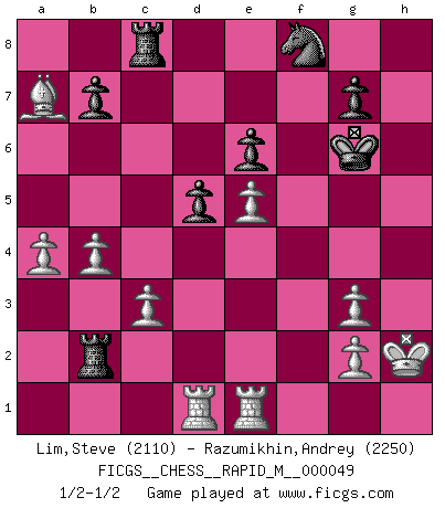 Last move : 1/2-1/2 2012 March 9 7:30:41 [Event "FICGS__CHESS__RAPID_M__000049"] [Site "FICGS"] [Date "2011.11.10"] [Round "1"] [White "Lim,Steve"] [Black "Razumikhin,Andrey"] [Result "1/2-1/2"] [WhiteElo "2110"] [BlackElo "2250"] 1.e4 c6 2.d4 d5 3.e5 Bf5 4.Nf3 e6 5.Be2 Nd7 6.O-O h6 7.Nbd2 Ne7 8.Re1 Bh7 9.b3 Nf5 10.Bd3 Bg6 11.c3 Be7 12.Nf1 O-O 13.Qc2 Qb6 14.Ng3 Nxg3 15.Bxg6 fxg6 16.fxg3 g5 17.h4 c5 18.hxg5 cxd4 19.Nxd4 Rac8 20.Qg6 hxg5 21.Bd2 Bc5 22.Kh2 Rf2 23.Rad1 Nf8 24.Qxg5 Qa6 25.a4 Qd3 26.Be3 Qh7+ 27.Qh4 Rb2 28.Qxh7+ Kxh7 29.b4 Bxd4 30.Bxd4 Kg6 31.Bxa7 1/2-1/2 Caro-Kann : Advance variation Kingside Castling by player White (move 6) Kingside Castling by player Black (move 12) This chess game ended in a draw. Follow this game move after move (download)Without error there can be no brilliancy. (Emanuel Lasker) Zeige mir drei Eröffnungsvarianten und ich beweise dir, dass zwei davon inkorrekt sind. (Emanuel Lasker) Aunque la mayoría de la gente disfruta observar las partidas de los grandes Maestros de ataque, algunos de los jugadores mas notables en la historia han sido los jugadores silenciosos posicionales. Lentamente ellos te aplastan despojandote de tu espacio, congestionando tus piezas y dejandote virtualmente sin nada que hacer. (Yasser Seirawan) Mais l'homme est une créature légère et illogique : semblable au joueur d'échecs, il n'aime que le processus du but à atteindre, non le but lui-même. (Dostoïevsky) It is not true that people stop pursuing dreams because they grow old, they grow old because they stop pursuing dreams. (Gabriel Garcia Marquez)