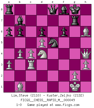 Last move : 1-0 2012 February 8 11:31:2 [Event "FICGS__CHESS__RAPID_M__000049"] [Site "FICGS"] [Date "2011.11.10"] [Round "1"] [White "Lim,Steve"] [Black "Kuster,Zeljko"] [Result "1-0"] [WhiteElo "2110"] [BlackElo "2132"] 1.e4 c5 2.Nf3 e6 3.d4 cxd4 4.Nxd4 Qb6 5.c3 a6 6.Bd3 Qc7 7.O-O Nf6 8.Qe2 d6 9.f4 Nbd7 10.c4 Be7 11.Nc3 O-O 12.Be3 b6 13.b4 Bb7 14.Rac1 h6 15.a3 Rfe8 16.f5 Bf8 17.fxe6 fxe6 18.Bb1 Re7 19.Qf3 Ne5 20.Qg3 Nfg4 21.Bd2 Qd7 22.Rf4 h5 23.h3 h4 24.Qxh4 Nf6 25.Nd5 exd5 26.exd5 Qe8 27.Rxf6 gxf6 28.Rc3 Rg7 29.Bh6 1-0 Sicilian defense Kingside Castling by player White (move 7) Kingside Castling by player Black (move 11) Player White won this chess game. Follow this game move after move (download)My opponents make good moves too. Sometimes I don't take these things into consideration. (Bobby Fischer) Mit sehr nachdenklichem Gesicht schreitet Bobby durch den Turniersaal. Was ist passiert?, fragt Lombardy. Ich stehe schlecht, antwortet Fischer. Lombardy: Dann biete doch einfach Remis an. Fischer: So schlecht stehe ich nun auch wieder nicht! (Robert James Fischer) No volvere nunca a jugar contigo. Has insultado a mi amigo. - cuando un oponente se maldijo por una mala jugada (Miguel Najdorf) Je menace de comprendre la position. (Anonyme) What doesn't kill us makes us stronger. (Friedrich Nietzsche)