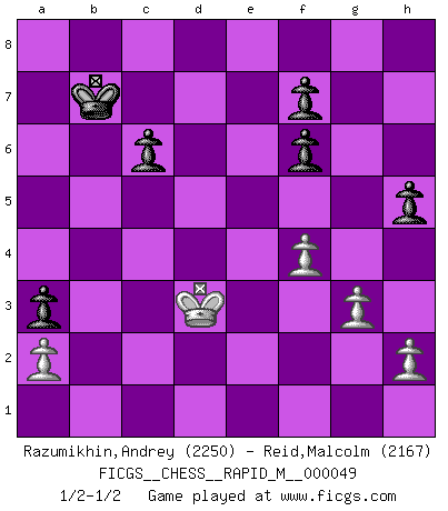 Last move : 1/2-1/2 2012 March 6 22:56:50 [Event "FICGS__CHESS__RAPID_M__000049"] [Site "FICGS"] [Date "2011.11.10"] [Round "1"] [White "Razumikhin,Andrey"] [Black "Reid,Malcolm"] [Result "1/2-1/2"] [WhiteElo "2250"] [BlackElo "2167"] 1.e4 d5 2.exd5 Nf6 3.Nf3 Qxd5 4.Nc3 Qd6 5.d4 a6 6.g3 Bg4 7.Bg2 Nc6 8.O-O O-O-O 9.d5 Ne5 10.Bf4 Nxf3+ 11.Bxf3 Bxf3 12.Qxf3 e5 13.dxe6 Qxe6 14.Bg5 Bd6 15.Rae1 Be5 16.Na4 Rhe8 17.Nc5 Qd5 18.Qxd5 Rxd5 19.Bxf6 gxf6 20.Nd3 Re6 21.Re4 h5 22.Kg2 Bd6 23.Rfe1 Kd7 24.Kf1 b5 25.Rh4 c6 26.b3 Kc7 27.Re3 Rf5 28.Kg2 Rxe3 29.fxe3 a5 30.c4 a4 31.bxa4 bxa4 32.Nf2 Bc5 33.Re4 Kd7 34.Kf1 Be7 35.Ke2 a3 36.Nd3 Bd6 37.c5 Bxc5 38.Rf4 Rxf4 39.Nxc5+ Kd6 40.Nb7+ Kc7 41.exf4 Kxb7 42.Kd3 1/2-1/2 Scandinavian defense Kingside Castling by player White (move 8) Queenside Castling by player Black (move 8) This chess game ended in a draw. Follow this game move after move (download)It is not a move, even the best move that you must seek, but a realizable plan. (Eugene Znosko-Borovsky) Im Schach gibt es keinen Platz für Galanterie. (Irving Chernev) La señal de un Gran Maestro es su habilidad de ganar una partida rápidamente y sin dolor. (Irving Chernev) Aucun coup ne doit être joué sans but. (Pedro Damiano) It's not the will to win, but the will to prepare to win that makes the difference. (Bear Bryant)