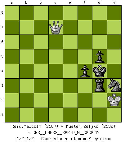 Last move : 1/2-1/2 2012 January 14 18:58:14 [Event "FICGS__CHESS__RAPID_M__000049"] [Site "FICGS"] [Date "2011.11.10"] [Round "1"] [White "Reid,Malcolm"] [Black "Kuster,Zeljko"] [Result "1/2-1/2"] [WhiteElo "2167"] [BlackElo "2132"] 1.e4 c5 2.b4 cxb4 3.a3 d5 4.exd5 Qxd5 5.Nf3 e5 6.axb4 Bxb4 7.c3 Bd6 8.Na3 Nc6 9.Bc4 Qe4+ 10.Be2 Nge7 11.O-O O-O 12.d4 exd4 13.Nb5 Qd5 14.Re1 h6 15.Ra4 a6 16.Bc4 axb5 17.Bxd5 bxa4 18.Ba2 Bg4 19.cxd4 b5 20.h3 Bh5 21.g4 Bg6 22.h4 b4 23.h5 Bh7 24.d5 Nb8 25.Bc4 Nd7 26.g5 a3 27.Nd4 hxg5 28.Ba2 Nf5 29.Nc6 g4 30.Bd2 Rfe8 31.Bxb4 Bxb4 32.Nxb4 Nh4 33.Re2 Nf6 34.d6 Rxe2 35.Qxe2 Nf3+ 36.Kg2 Be4 37.Qe3 Rb8 38.Qxa3 Rb5 39.d7 Ne5 40.Kf1 Nexd7 41.Qc3 Rxh5 42.Qc8+ Nf8 43.Ke2 Re5 44.Kf1 Bf3 45.Qc7 N8d7 46.Qd8+ Re8 47.Qc7 g6 48.Nd5 Bxd5 49.Bxd5 Nxd5 50.Qxd7 Nf6 51.Qd4 Kg7 52.Kg2 Re4 53.Qd6 Nh5 54.Qc5 Rf4 55.Qg5 Kg8 56.Qd8+ Kh7 57.Qf8 Rf5 58.Qd8 Kh6 59.Qe7 Rf3 60.Qh4 f5 61.Qe7 Nf4+ 62.Kg1 g3 63.Qh4+ Nh5 64.fxg3 Rxg3+ 65.Kf2 Rd3 66.Qb4 Kg5 67.Qe7+ Nf6 68.Kg2 Rc3 69.Kg1 Rc4 70.Qe3+ Kh5 71.Qh3+ Rh4 72.Qf3+ Kh6 73.Qc3 Ne4 74.Qh8+ Kg5 75.Qd8+ Kh5 76.Kg2 Rg4+ 77.Kf3 Ng5+ 78.Kf2 Rc4 79.Qd1+ Kh4 80.Qd8 Re4 81.Qf6 Kh5 82.Qg7 Rc4 83.Ke3 f4+ 84.Kf2 Rc3 85.Qd4 Nh3+ 86.Kg2 Rg3+ 87.Kh2 g5 88.Qh8+ Kg4 89.Qc8+ Kh5 90.Qe8+ Kg4 91.Qd7+ 1/2-1/2 Sicilian : wing gambit, Marshall variation Kingside Castling by player White (move 11) Kingside Castling by player Black (move 11) 10 pieces endgame at move 49 : White KQP , Black KRNNPPP WHITE : King + 1 Queen 1 Pawn BLACK : King + 1 Rook 2 Knights 3 Pawns 9 pieces endgame at move 50 : White KQP , Black KRNPPP WHITE : King + 1 Queen 1 Pawn BLACK : King + 1 Rook 1 Knight 3 Pawns 8 pieces endgame at move 64 : White KQP , Black KRNPP WHITE : King + 1 Queen 1 Pawn BLACK : King + 1 Rook 1 Knight 2 Pawns 7 pieces endgame at move 64 : White KQ , Black KRNPP WHITE : King + 1 Queen BLACK : King + 1 Rook 1 Knight 2 Pawns This chess game ended in a draw. Follow this game move after move (download)Bobby is the finest Chess player this country ever produced. His memory for the moves, his brilliance in dreaming up combinations, and his fierce determination to win are uncanny. (John Collins) Schon mancher Spieler hat aufgegeben, um zu vermeiden, daß er eine Figur verliert. (Savielly Grigorievitsch Tartakower) El Ajedrez es como la guerra en un tablero. (Bobby Fischer) Mais n'est-ce pas déjà le limiter injurieusement que d'appeler les échecs un jeu? N'est-ce pas aussi une science, un art, ou quelque chose qui, comme le cercueil de Mahomet entre ciel et terre, est suspendu entre l'un et l'autre, et qui réunit un nombre incroyable de contraires ? (Stefan Zweig) Methinks King Thibault should dub Marius Zubac a knight of the square board... I mean table, henceforth addressing him as Sir Marius, and bestow on him a suitable land from the kingdom of FICGS & marry him off to a worthy, fair maiden, lest he slice our heads with his mighty sword in his wrath. (Dinesh De Silva)