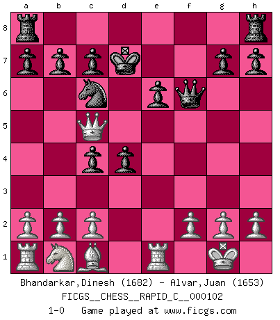 Last move : 1-0 2012 January 11 5:52:20 [Event "FICGS__CHESS__RAPID_C__000102"] [Site "FICGS"] [Date "2011.11.11"] [Round "1"] [White "Bhandarkar,Dinesh"] [Black "Alvar,Juan"] [Result "1-0"] [WhiteElo "1682"] [BlackElo "1653"] 1.e4 e5 2.Nf3 Nc6 3.Bc4 Nf6 4.d4 exd4 5.O-O Bc5 6.e5 d5 7.exf6 dxc4 8.Re1+ Be6 9.Ng5 Qxf6 10.Nxe6 fxe6 11.Qh5+ Kd7 12.Qxc5 1-0 This chess game has been lost on time (started : 2011.11.11 5:2:32) Two knights : Max Lange attack Kingside Castling by player White (move 5) Player White won this chess game. Follow this game move after move (download)Chess is a terrific way for kids to build self image and self esteem. (Saudin Robovic) Wir können eben der zündenden Macht des Opfers nicht wiederstehen, denn die Begeisterung für das Opfer liegt in der Natur des Menschen. (Rudolf Spielmann) El Ajedrez es un juego terrible. Si no dominas el centro, tu oponente tiene una posición mas libre. Si tu tienes el centro, entonces realmente tienes algo de que preocuparte. (Siegbert Tarrasch) Les écrivains ont utilisé les échecs pour analyser les côtés extrêmes de la nature humaine. Dans ce cadre, les échecs offrent un champ d'expérimentation idéal. Mais on pourrait faire la même chose avec la peinture. Et là, en vous référant à Van Gogh, vous ne tirerez pas de conclusion définitive sur les peintres. (Gary Kasparov) Life is like a ten-speed bicycle: most of us have gears we never use. (Charles M. Schulz)