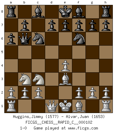 Last move : 1-0 2011 December 23 5:4:10 [Event "FICGS__CHESS__RAPID_C__000102"] [Site "FICGS"] [Date "2011.11.11"] [Round "1"] [White "Huggins,Jimmy"] [Black "Alvar,Juan"] [Result "1-0"] [WhiteElo "1577"] [BlackElo "1653"] 1.e4 c5 2.Nf3 Nc6 3.d4 cxd4 4.Nxd4 Qb6 5.Nb3 Nf6 6.Nc3 a6 7.Be3 1-0 This chess game has been lost on time (started : 2011.11.11 5:2:32) Sicilian defense Player White won this chess game. Follow this game move after move (download)Fischer wanted to give the Russians a taste of their own medicine. (Larry Evans) Konzentriere dich auf materielle Gewinne. Nimm, was dir dein Gegner gibt, ausser es gibt einen guten Grund der dagegenspricht. (Robert James Fischer) Yo adoro todas la posiciones. Denme una partida posicional difícil, y la jugaré. Pero posiciones totalmente ganadas, no las tolero. (Hein Donner) Toutes les manuvres exécutées sur une colonne ouverte ont pour but ultime l'intrusion définitive sur la septième ou la huitième rangée, en plein cur de la position ennemie. (Aaron Nimzovitch) The next best thing to gambling and winning is gambling and loosing. (Nick Dandalos)