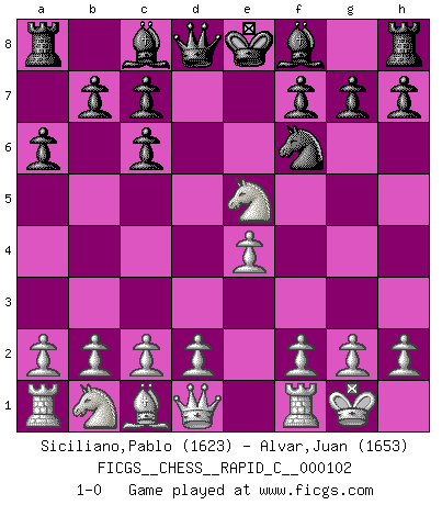 Last move : 1-0 2012 January 22 6:26:17 [Event "FICGS__CHESS__RAPID_C__000102"] [Site "FICGS"] [Date "2011.11.11"] [Round "1"] [White "Siciliano,Pablo"] [Black "Alvar,Juan"] [Result "1-0"] [WhiteElo "1623"] [BlackElo "1653"] 1.e4 e5 2.Nf3 Nc6 3.Bb5 Nf6 4.O-O a6 5.Bxc6 dxc6 6.Nxe5 1-0 This chess game has been lost on time (started : 2011.11.11 5:2:32) Ruy Lopez : Berlin defense, 4.O-O Kingside Castling by player White (move 4) Player White won this chess game. Follow this game move after move (download)I don't believe in psychology. I believe in good moves. (Bobby Fischer) Immer nach dem besten Zug zu suchen ist ziemlich unpraktisch. (Nigel Short) El Ajedrez, como cualquier actividad creativa, solo puede existir a través del esfuerzo combinado de aquellos que tienen talento creativo y de aquellos que poseen la habilidad de organizar su trabajo creativo. (Mikhail Botvinnik) Seul un grand joueur sait à quel point il joue faiblement. (Xavier Tartacover) I'll be back. (Arnold Schwarzenegger)