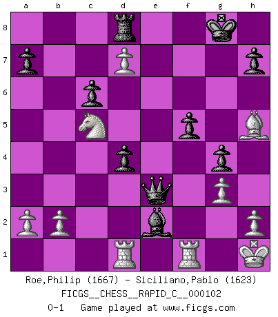 Last move : 0-1 2012 February 19 3:28:13 [Event "FICGS__CHESS__RAPID_C__000102"] [Site "FICGS"] [Date "2011.11.11"] [Round "1"] [White "Roe,Philip"] [Black "Siciliano,Pablo"] [Result "0-1"] [WhiteElo "1667"] [BlackElo "1623"] 1.Nc3 e5 2.Nf3 Nc6 3.d4 exd4 4.Nxd4 Bc5 5.Nxc6 bxc6 6.g3 d5 7.Bg2 Nf6 8.O-O O-O 9.Na4 Bd6 10.Be3 Qe7 11.c4 Ba6 12.c5 Be5 13.Re1 Ng4 14.Bd4 Qf6 15.Bxe5 Qxf2+ 16.Kh1 Ne3 17.Bf3 Nxd1 18.Raxd1 Qe3 19.Bxc7 g5 20.Bd6 Rfe8 21.Nc3 f5 22.Bh5 Re6 23.Rf1 Rxd6 24.cxd6 d4 25.d7 Rd8 26.Na4 g4 27.Nc5 Bxe2 0-1 Dunst (Sleipner-Heinrichsen) Opening Kingside Castling by player White (move 8) Kingside Castling by player Black (move 8) Player Black won this chess game. Follow this game move after move (download)Fischer, who may or may not be mad as a hatter, has every right to be horrified. (Jeremy Silman) Ein Springer auf f6 gegen die eigene Rochadestellung ist schlimmer als ein rostiger Nagel im Knie. (Efim Bogoljubov) Si el ingenio solamente fuese necesario para lucirse, las mujeres serían las mejores jugadoras de Ajedrez del mundo. (Albin) Les échecs, c'est l'imagination. (David Bronstein) Internal peace cannot coexist with external war. (Don Groves)