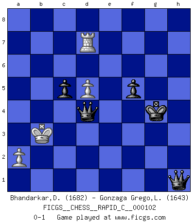 Last move : 0-1 2012 January 2 6:43:28 [Event "FICGS__CHESS__RAPID_C__000102"] [Site "FICGS"] [Date "2011.11.11"] [Round "1"] [White "Bhandarkar,Dinesh"] [Black "Gonzaga Grego,Luis"] [Result "0-1"] [WhiteElo "1682"] [BlackElo "1643"] 1.e4 c5 2.Nf3 d6 3.d4 cxd4 4.Nxd4 Nf6 5.Nc3 g6 6.Bc4 Bg7 7.f3 Nc6 8.Be3 O-O 9.Bb3 Bd7 10.Qd2 Rc8 11.h4 Ne5 12.h5 Nxh5 13.g4 Nf6 14.O-O-O Nc4 15.Bxc4 Rxc4 16.Bh6 Nxe4 17.Qe3 Rxc3 18.bxc3 Nf6 19.Bxg7 Kxg7 20.Rh2 Qa5 21.Nb3 Qa3+ 22.Kb1 Re8 23.Rdh1 e5 24.c4 a5 25.c3 Kg8 26.Ka1 Bc6 27.Rh4 Rc8 28.Qd3 a4 29.Nd2 Qc5 30.Rh6 a3 31.g5 e4 32.fxe4 Qxg5 33.R6h3 Qe5 34.Re1 Re8 35.Rhe3 h5 36.Nf3 Qc5 37.Nd2 Ng4 38.R3e2 Ne5 39.Qd4 f6 40.Rg2 Kg7 41.Rh2 Kh6 42.Rf2 Qxd4 43.cxd4 Nd3 44.Rfe2 Nxe1 45.Rxe1 h4 46.d5 Bd7 47.Nf3 g5 48.Nd4 f5 49.Rb1 Rxe4 50.Nc2 h3 51.Nxa3 g4 52.Rxb7 h2 53.Rb1 g3 54.Rh1 Kg5 55.Nc2 Kg4 56.c5 dxc5 57.Kb2 Kh3 58.Ne1 Rxe1 59.Rxe1 g2 60.Re3+ Kg4 61.Re7 g1Q 62.Rxd7 Qd4+ 63.Kb3 h1Q 0-1 Sicilian : Dragon variation Kingside Castling by player Black (move 8) Queenside Castling by player White (move 14) 10 pieces endgame at move 59 : White KRPP , Black KBPPPP WHITE : King + 1 Rook 2 Pawns BLACK : King + 1 Bishop 4 Pawns Promotion Queen by player Black (move 61) 9 pieces endgame at move 62 : White KRPP , Black KQPPP WHITE : King + 1 Rook 2 Pawns BLACK : King + 1 Queen 3 Pawns Promotion Queen by player Black (move 63) Player Black won this chess game. Follow this game move after move (download)The sign of a great Master is his ability to win a won game quickly and painlessly. (Irving Chernev) Kein Großmeister ist normal. Sie unterscheiden sich nur im Ausmaß Ihrer Verrücktheit. (Viktor Kortschnoi) La táctica fluye a partir de una posición superior. (Bobby Fischer) Toute estimation doit être constamment réévaluée. (Jacob Estrin) If only people were all showed a certain minimum level of niceness; if only people didn't retract verbal draw offers (without draw box ticked) on ficgs; if only people didn't kill; if only people didn't run concentration / extermination camps, if only people didn't drop nuclear bombs on Hiroshima and Nagasaki, and so on - it would be a much more beautiful world. But sadly, things are not so... (Normajean Yates)