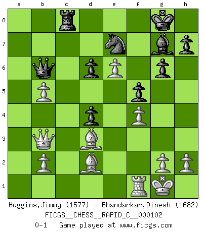 Last move : 0-1 2012 March 23 5:56:45 [Event "FICGS__CHESS__RAPID_C__000102"] [Site "FICGS"] [Date "2011.11.11"] [Round "1"] [White "Huggins,Jimmy"] [Black "Bhandarkar,Dinesh"] [Result "0-1"] [WhiteElo "1577"] [BlackElo "1682"] 1.e4 e5 2.Nf3 Nc6 3.Bb5 a6 4.Ba4 Nge7 5.c3 Ng6 6.d4 b5 7.Bc2 Be7 8.d5 Nb8 9.a4 Bb7 10.O-O d6 11.axb5 axb5 12.Rxa8 Bxa8 13.Na3 c6 14.dxc6 Bxc6 15.Qe2 Qb6 16.Bd3 b4 17.Nc4 Qa7 18.cxb4 O-O 19.Na5 Qb6 20.Nxc6 Nxc6 21.b5 Nd4 22.Nxd4 exd4 23.f4 Bf6 24.Qc2 Ne7 25.Bd2 Rc8 26.Qb3 g6 27.e5 Bg7 28.e6 f5 0-1 Ruy Lopez : Cozio defense deferred Kingside Castling by player White (move 10) Kingside Castling by player Black (move 18) Player Black won this chess game. Follow this game move after move (download)Combinations have always been the most intriguing aspect of Chess. The masters look for them, the public applauds them, the critics praise them. It is because combinations are possible that Chess is more than a lifeless mathematical exercise. They are the poetry of the game; they are to Chess what melody is to music. They represent the triumph of mind over matter. (Reuben Fine) Im Hotelzimmer gab es nur zwei Schaben. (Über die Turnierbedingungen) (Peter Swidler) Cuando la partida de Ajedrez termina, el Peón y el Rey regresan a la misma caja. (Irish saying) Les Echecs ne sont pas pour les âmes timides. Ils requièrent un homme entier, qui ne s'arrête pas aveuglément à ce qui a été déjà établi, mais qui tente individuellement de sonder les profondeurs du jeu. (W. Steinitz) You cannot beat a roulette table unless you steal money from it. (Albert Einstein)