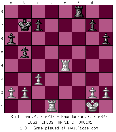 Last move : 1-0 2012 February 17 6:16:12 [Event "FICGS__CHESS__RAPID_C__000102"] [Site "FICGS"] [Date "2011.11.11"] [Round "1"] [White "Siciliano,Pablo"] [Black "Bhandarkar,Dinesh"] [Result "1-0"] [WhiteElo "1623"] [BlackElo "1682"] 1.e4 e5 2.Nf3 Nc6 3.Bb5 Nge7 4.O-O a6 5.Bc4 Ng6 6.Nc3 Bc5 7.Nd5 d6 8.c3 O-O 9.d4 Ba7 10.Bg5 Qd7 11.Be3 Nce7 12.dxe5 dxe5 13.Bxa7 Rxa7 14.Ne3 Qc6 15.Ng5 b5 16.Bb3 h6 17.Nxf7 Rxf7 18.Qd8+ Nf8 19.Bxf7+ Kxf7 20.f4 Nfg6 21.fxe5 Ke6 22.Rad1 Qxe4 23.Nd5 Nxd5 24.Qxc8+ Ke7 25.Qg8 Kd7 26.Rfe1 Qf5 27.Qxd5+ Kc8 28.Qd8+ Kb7 29.e6 Ra8 30.e7 Nxe7 31.Qxe7 Rf8 32.Qe4+ Qxe4 33.Rxe4 1-0 Ruy Lopez : Cozio defense Kingside Castling by player White (move 4) Kingside Castling by player Black (move 8) Player White won this chess game. Follow this game move after move (download)We like to think. (Gary Kasparov) Später, ... hatte ich zunehmend Erfolg in entscheidenden Partien. Vielleicht weil ich eine einfache Wahrheit erkannte: nicht nur ich hatte Angst, auch mein Gegner. (Mikhail Nekhemyevich Tal) El Ajedrez es como la guerra en un tablero. (Bobby Fischer) Des combinaisons [dans le jeu d'échecs] pareilles à des mélodies. Je crois entendre pour ainsi dire la musique des coups... (Vladimir Nabokov) Gambling : The sure way of getting nothing from something. (Wilson Mizner)