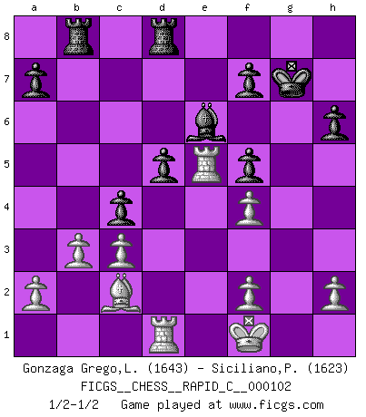 Last move : 1/2-1/2 2012 February 2 6:8:51 [Event "FICGS__CHESS__RAPID_C__000102"] [Site "FICGS"] [Date "2011.11.11"] [Round "1"] [White "Gonzaga Grego,Luis"] [Black "Siciliano,Pablo"] [Result "1/2-1/2"] [WhiteElo "1643"] [BlackElo "1623"] 1.Nc3 e5 2.e4 Nf6 3.Nf3 Nc6 4.d4 exd4 5.Nxd4 Bb4 6.Nxc6 bxc6 7.Bd3 d5 8.exd5 cxd5 9.O-O O-O 10.Bg5 c6 11.Qf3 Bd6 12.Rfe1 h6 13.Bxf6 Qxf6 14.Qxf6 gxf6 15.Ne2 c5 16.b3 Be6 17.Rad1 Rab8 18.g3 Rfd8 19.c3 Be5 20.Nf4 Bxf4 21.gxf4 f5 22.Re5 c4 23.Bc2 Kg7 24.Kf1 1/2-1/2 Dunst (Sleipner-Heinrichsen) Opening Kingside Castling by player White (move 9) Kingside Castling by player Black (move 9) This chess game ended in a draw. Follow this game move after move (download)When I asked Fischer why he had not played a certain move in our game, he replied: 'Well, you laughed when I wrote it down !' (Mikhail Tal) Ich glaube nicht an Psychologie, ich glaube an gute Züge. (Robert James Fischer) No es tiempo de jugar al Ajedrez cuando la casa esta en llamas. (Proverbio Italiano) Aidez vos pièces, elles vous aideront. (Paul Morphy) The beginning of wisdom is silence. The second step is listening. (Unknown)