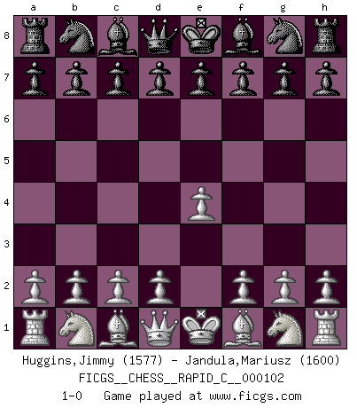 Last move : 1-0 2011 December 11 16:0:39 [Event "FICGS__CHESS__RAPID_C__000102"] [Site "FICGS"] [Date "2011.11.11"] [Round "1"] [White "Huggins,Jimmy"] [Black "Jandula,Mariusz"] [Result "1-0"] [WhiteElo "1577"] [BlackElo "1600"] 1.e4 1-0 This chess game has been lost on time (started : 2011.11.11 5:2:32) King's pawn Opening Player White won this chess game. Follow this game move after move (download)What would Chess be without silly mistakes ? (Kurt Richter) Alle offensichtlichen Züge sehen nach dem Spiel in der Analyse verdächtig aus. (Viktor Kortschnoi) Yo adoro todas la posiciones. Denme una partida posicional difícil, y la jugaré. Pero posiciones totalmente ganadas, no las tolero. (Hein Donner) Vous n'êtes pas toujours obligé de jouer le meilleur coup. Un coup doit être actif, entreprenant, correct et beau ! (David Bronstein) Creativity is allowing yourself to make mistakes. Art is knowing which ones to keep. (Scott Adams)
