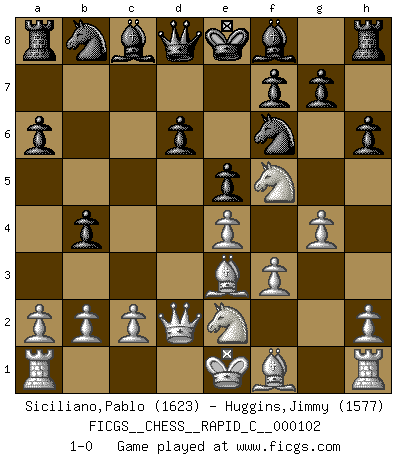 Last move : 1-0 2012 March 23 5:56:56 [Event "FICGS__CHESS__RAPID_C__000102"] [Site "FICGS"] [Date "2011.11.11"] [Round "1"] [White "Siciliano,Pablo"] [Black "Huggins,Jimmy"] [Result "1-0"] [WhiteElo "1623"] [BlackElo "1577"] 1.e4 c5 2.Nf3 d6 3.d4 cxd4 4.Nxd4 Nf6 5.Nc3 e6 6.g4 h6 7.Be3 a6 8.f3 b5 9.Qd2 b4 10.Nce2 e5 11.Nf5 1-0 Sicilian : Scheveningen, Keres attack Player White won this chess game. Follow this game move after move (download)All Chess players should have a hobby. (Savielly Tartakower) Gegen einen Schachcomputer zu verlieren ist wie Löcher in den Strümpfen zuhaben. Es ist nicht peinlich, solange man der einzige ist der es weiß. (Anonymous) Bobby solo arroja las piezas y solas caen en las casillas correctas. (Miguel Najdorf ) La conception d'un plan est le processus par lequel un joueur exploite les avantages de sa position tout en s'efforçant d'en réduire au minimum les inconvénients. Afin de garantir le succès, un plan doit toujours se fonder sur un diagnostic objectif des particularités d'une position. La conception d'un plan est d'autant plus difficile que la position est équilibrée, et grandement facilitée lorsqu'il n'existe qu'un seul plan susceptible de répondre aux exigences de la position. (Harry Golombek) I have opinions of my own - strong opinions - but I don't always agree with them. (George Bush)