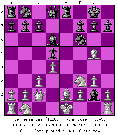 Last move : 0-1 2011 November 29 19:24:5 [Event "FICGS__CHESS__UNRATED_TOURNAMENT__000023"] [Site "FICGS"] [Date "2011.11.11"] [Round "1"] [White "Jefferis,Des"] [Black "Riha,Josef"] [Result "0-1"] [WhiteElo "1186"] [BlackElo "1945"] 1.e4 e6 2.d4 d5 3.exd5 exd5 4.Nf3 Nf6 5.c3 Bd6 6.g3 O-O 7.Be2 Bh3 8.Bg5 Re8 9.Qc2 Bg2 0-1 French : Exchange variation Kingside Castling by player Black (move 6) Player Black won this chess game. Follow this game move after move (download)When in doubt... play Chess ! (Tevis) Schon mancher Spieler hat aufgegeben, um zu vermeiden, daß er eine Figur verliert. (Savielly Grigorievitsch Tartakower) a manera como él juega al Ajedrez, demuestra la completa naturaleza de un hombre. (Stanley Ellin) Les échecs sont plus proches de l'art de l'assassinat que de l'art de la guerre. (Arturo Perez-Reverte) In fact if nothing is done against this teddy bear, hereby I announce that I would quit chess, rapid chess, blitz chess, postal chess, email chess, server chess and correspondence chess I will then switch to a table game where teddy bears aren't going to be seen for a while, like Poker, or Roulette, all 18+ games. (Elmer Valderrama)