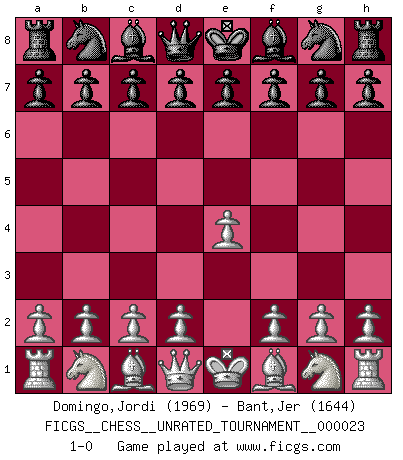 Last move : 1-0 2011 December 22 4:55:47 [Event "FICGS__CHESS__UNRATED_TOURNAMENT__000023"] [Site "FICGS"] [Date "2011.11.11"] [Round "1"] [White "Domingo,Jordi"] [Black "Bant,Jer"] [Result "1-0"] [WhiteElo "1969"] [BlackElo "1644"] 1.e4 1-0 This chess game has been lost on time (started : 2011.11.11 13:43:19) King's pawn Opening Player White won this chess game. Follow this game move after move (download)Look at Garry Kasparov. After he loses, invariably he wins the next game. He just kills the next guy. That's something that we have to learn to be able to do. (Maurice Ashley) Die Neutralität betrachte ich als eine schwere Krankheit. (Viktor Kortschnoi) Diferente gente reacciona diferentemente en aceptar la derrota. (Bobby Fischer) Si le désir cupide (et stupide) de gagner est une inépuisable source de souffrance, une combinaison brillante sur l'échiquier est une découverte : le coquelicot qui s'épanouit lorsque apparaît la Voie Lactée. (Arrabal) The arrogant army will lose certainly the battle. (Chinese proverb)