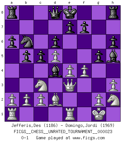 Last move : 0-1 2011 December 18 11:29:41 [Event "FICGS__CHESS__UNRATED_TOURNAMENT__000023"] [Site "FICGS"] [Date "2011.11.11"] [Round "1"] [White "Jefferis,Des"] [Black "Domingo,Jordi"] [Result "0-1"] [WhiteElo "1186"] [BlackElo "1969"] 1.e4 h6 2.d4 c5 3.d5 d6 4.Nf3 g5 5.Nc3 Bg7 6.Bd2 Nd7 7.Bb5 a6 8.Bxd7+ Bxd7 9.O-O Nf6 10.Re1 Bg4 11.Qe2 Nd7 12.Qe3 b5 13.h3 Bh5 14.Nh2 Nb6 15.f4 Bd4 0-1 Carr's defense Kingside Castling by player White (move 9) Player Black won this chess game. Follow this game move after move (download)What is the difference between chess and football? Everybody understands football, but nobody plays it. Everybody plays chess, but nobody understands it. Everything is relative. (Vladimir Kramnik) Um sich vor der Gefahr einer Erkältung zu schützen, sorge der wanderlustige König beizeiten für ein brauchbares Versteck. (Aaron Nimzowitsch) Yo he agregado estos principios a la ley: pongan los Caballos en acción antes de que los dos Alfiles sean desarrollados. (Emanuel Lasker) Roi des jeux et jeu des rois, les échecs portent en eux un sentiment d'infini. Ils donnent à celui qui s'est efforcé d'en approfondir les arcanes l'impression de n'être pas à la mesure de l'homme; en fait, ils constituent un résumé de l'univers, un microcosme, et figurent cette grande échelle qui, dans les plans de la lumière descend jusqu'à la matière, qui des abîmes insondables remonte jusqu'en l'infini de Dieu. (Pyrame) However beautiful the strategy, you should occasionally look at the results. (Winston Churchill)