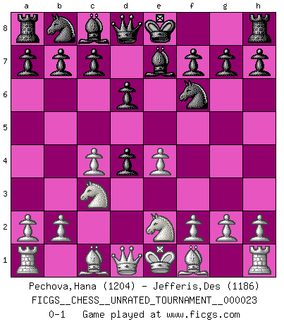 Last move : 0-1 2011 December 25 17:19:52 [Event "FICGS__CHESS__UNRATED_TOURNAMENT__000023"] [Site "FICGS"] [Date "2011.11.11"] [Round "1"] [White "Pechova,Hana"] [Black "Jefferis,Des"] [Result "0-1"] [WhiteElo "1204"] [BlackElo "1186"] 1.c4 e5 2.Nc3 d6 3.e4 Nf6 4.Nge2 Be7 5.d4 exd4 0-1 This chess game has been lost on time (started : 2011.11.11 13:43:19) English Opening Player Black won this chess game. Follow this game move after move (download)Chess holds its master in its own bonds, shackling the mind and brain so that the inner freedom of the very strongest must suffer. (Albert Einstein) Der vorletzte Fehler gewinnt. (Savielly Grigorievitsch Tartakower) El Ajedrez es 99 por ciento táctica. (Teichmann) Le jeu d'échecs est comme rejeté hors du temps. (Antoine de Saint-Exupéry) Opportunities multiply as they are seized. (Sun Tzu)