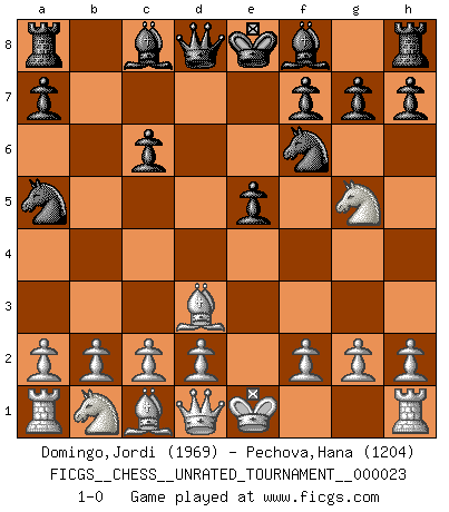 Last move : 1-0 2011 December 23 17:3:31 [Event "FICGS__CHESS__UNRATED_TOURNAMENT__000023"] [Site "FICGS"] [Date "2011.11.11"] [Round "1"] [White "Domingo,Jordi"] [Black "Pechova,Hana"] [Result "1-0"] [WhiteElo "1969"] [BlackElo "1204"] 1.e4 e5 2.Nf3 Nc6 3.Bc4 Nf6 4.Ng5 d5 5.exd5 Na5 6.Bb5+ c6 7.dxc6 bxc6 8.Bd3 1-0 This chess game has been lost on time (started : 2011.11.11 13:43:19) Two knights defense Player White won this chess game. Follow this game move after move (download)A man that will take back a move at Chess will pick a pocket. (Richard Fenton) Die Leute spielen gegen mich seit 15 Jahren unter Ihren Möglichkeiten. (Robert James Fischer) En el tablero, la mentira e hipocresía no sobreviven mucho. (Emanuel Lasker) Que feriez-vous si vous étiez en train de jouer aux échecs et que la fin du monde arrive ? Je continuerais à jouer. (Saint Borromée) Indecision is the key to flexibility. (Unknown)