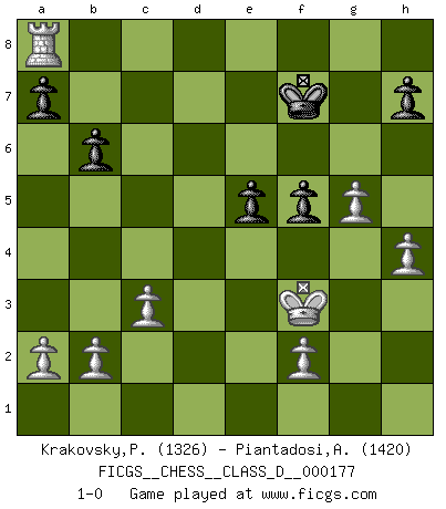 Last move : 1-0 2012 January 22 3:18:5 [Event "FICGS__CHESS__CLASS_D__000177"] [Site "FICGS"] [Date "2011.11.13"] [Round "1"] [White "Krakovsky,Peter"] [Black "Piantadosi,Angelo"] [Result "1-0"] [WhiteElo "1326"] [BlackElo "1420"] 1.e4 e6 2.d4 d5 3.Nc3 dxe4 4.Nxe4 Nd7 5.Nf3 Ngf6 6.Nxf6+ Nxf6 7.Be2 Be7 8.O-O O-O 9.c3 b6 10.Ne5 Bb7 11.Bf3 Bxf3 12.Qxf3 c5 13.dxc5 Bxc5 14.Bg5 Qd5 15.Bxf6 Qxf3 16.gxf3 gxf6 17.Nd7 Rfc8 18.Nxf6+ Kg7 19.Ne4 Be7 20.Rad1 Rc7 21.f4 Rac8 22.Kg2 f6 23.Kf3 f5 24.Rg1+ Kf8 25.Ng5 Bxg5 26.fxg5 Kf7 27.h4 e5 28.Rd6 Ke7 29.Rgd1 Rg8 30.Rh6 Kf8 31.Re6 Re7 32.Rd8+ Kf7 33.Rxe7+ Kxe7 34.Rxg8 Kf7 35.Ra8 1-0 French : Rubinstein variation Kingside Castling by player White (move 8) Kingside Castling by player Black (move 8) Player White won this chess game. Follow this game move after move (download)After black's reply to 1.e4 with 1..e5, leaves him always trying to get into the game. (Howard Staunton) Habe Mut, dich deines eigenen Verstandes zu bedienen. (Immanuel Kant) Yo nunca en mi vida he jugado la Defensa Francesa, que viene siendo la más aburrida de todas las Aperturas. (Wilhelm Steinitz) On entre au jeu d'Echecs comme on entre en Religion. Pour le joueur d'Echecs, la partie d'Echecs c'est l'office, la messe, le défilé du 1er Mai, le dépôt de gerbe au Monument aux Morts. C'est un drame sacré. (Michel Roos) Political correctness is subjecting us to gross incompetence. (Johann Piek)