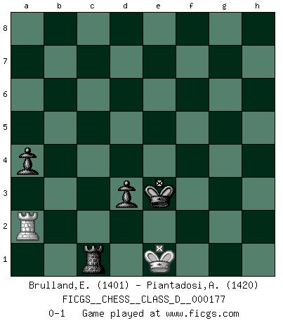 Last move : 0-1 2012 March 1 17:51:9 [Event "FICGS__CHESS__CLASS_D__000177"] [Site "FICGS"] [Date "2011.11.13"] [Round "1"] [White "Brulland,Emmanuel"] [Black "Piantadosi,Angelo"] [Result "0-1"] [WhiteElo "1401"] [BlackElo "1420"] 1.b3 Nf6 2.g3 g6 3.Bb2 Bg7 4.Bg2 O-O 5.e3 d5 6.Ne2 c5 7.d3 Nc6 8.Nd2 b6 9.O-O Bb7 10.Rb1 Qc7 11.a3 e5 12.Nc3 a6 13.Nxd5 Nxd5 14.Bxd5 Ne7 15.Bxb7 Qxb7 16.e4 Rad8 17.Nc4 f6 18.Qe2 Nc6 19.f4 b5 20.Nd2 Nd4 21.Bxd4 cxd4 22.f5 Rc8 23.Qd1 Rc3 24.Rb2 Rfc8 25.Nb1 R3c7 26.Rf2 Bh6 27.Kg2 Be3 28.Re2 Rc6 29.Nd2 Bxd2 30.Rxd2 gxf5 31.Re2 fxe4 32.Rxe4 Kh8 33.Kg1 Qf7 34.Re2 Qg6 35.Kf2 Qf5+ 36.Kg2 Rg8 37.Rf2 Qg6 38.Qe2 h5 39.Qf3 h4 40.Rb1 hxg3 41.hxg3 Kg7 42.Rh1 Rh8 43.Rxh8 Kxh8 44.Qe4 Qxe4+ 45.dxe4 Kg7 46.Kf3 Kg6 47.a4 bxa4 48.bxa4 Rc4 49.Rd2 Rxa4 50.Rd1 a5 51.Rc1 Rc4 52.Ra1 a4 53.Ra2 Kg5 54.Kf2 f5 55.exf5 Kxf5 56.Ke2 Kg4 57.Kf2 e4 58.Kg2 d3 59.cxd3 exd3 60.Kf1 Kxg3 61.Ke1 Kf3 62.Kd1 Ke3 63.Ke1 Rc1+ 0-1 Nimzovich-Larsen attack : Indian variation Kingside Castling by player Black (move 4) Kingside Castling by player White (move 9) 10 pieces endgame at move 55 : White KRPPP , Black KRPPP WHITE : King + 1 Rook 3 Pawns BLACK : King + 1 Rook 3 Pawns 9 pieces endgame at move 55 : White KRPP , Black KRPPP WHITE : King + 1 Rook 2 Pawns BLACK : King + 1 Rook 3 Pawns 8 pieces endgame at move 59 : White KRPP , Black KRPP WHITE : King + 1 Rook 2 Pawns BLACK : King + 1 Rook 2 Pawns 7 pieces endgame at move 59 : White KRP , Black KRPP WHITE : King + 1 Rook 1 Pawn BLACK : King + 1 Rook 2 Pawns 6 pieces endgame at move 60 : White KR , Black KRPP WHITE : King + 1 Rook BLACK : King + 1 Rook 2 Pawns Player Black won this chess game. Follow this game move after move (download)Adequate compensation for a sacrifice is having a sound combination leading to a winning position; adequate compensation for a blunder is having your opponent snatch defeat from the jaws of victory. (Bruce A. Moon) Irgendwie scheint mir sonntags früh um 9 Uhr der Killerinstinkt verloren gegangen zu sein. (Alexej Shirov) Un Peón pasado aumenta su poder a medida de que el número de piezas en el tablero disminuye. (Capablanca) Tout change constamment, y compris dans le monde des Echecs. (Botvinnik) The general who wins the battle makes many calculations in his temple before the battle is fought. The general who loses makes but few calculations beforehand. (Sun Tzu)