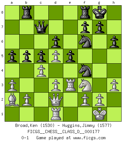 Last move : 0-1 2012 April 25 12:11:56 [Event "FICGS__CHESS__CLASS_D__000177"] [Site "FICGS"] [Date "2011.11.13"] [Round "1"] [White "Broad,Ken"] [Black "Huggins,Jimmy"] [Result "0-1"] [WhiteElo "1530"] [BlackElo "1577"] 1.e4 e5 2.Nf3 Nc6 3.Bb5 a6 4.Ba4 Nf6 5.Nc3 b5 6.Bb3 Bc5 7.O-O O-O 8.Re1 d6 9.d3 h6 10.h3 Ne7 11.Be3 Bxe3 12.Rxe3 Ng6 13.Qd2 Bb7 14.Rd1 c5 15.a3 Qc7 16.Ba2 Rab8 17.Nd5 Bxd5 18.exd5 Nf4 19.c4 a5 0-1 Ruy Lopez : Four knights (Tarrasch) variation Kingside Castling by player White (move 7) Kingside Castling by player Black (move 7) Player Black won this chess game. Follow this game move after move (download)A thorough understanding of the typical mating continuations makes the most complicated sacrificial combinations leading up to them not only not difficult, but almost a matter of course. (Siegbert Tarrasch) Bogoljubow: Matt in vier Zügen! Tartakower: Ich verbitte mir jede Belästigung! (Savielly Grigorievitsch Tartakower) Muchos se han convertido en Maestros de Ajedrez, nadie se ha convertido en el Maestro del Ajedrez. (Siegbert Tarrasch) Le thème de l'attaque double intervient d'une manière ou d'une autre dans l'immense majorité des combinaisons. (Youri Averbakh) The real danger is not that computers will begin to think like men, but that men will begin to think like computers. (Sydney J. Harris)
