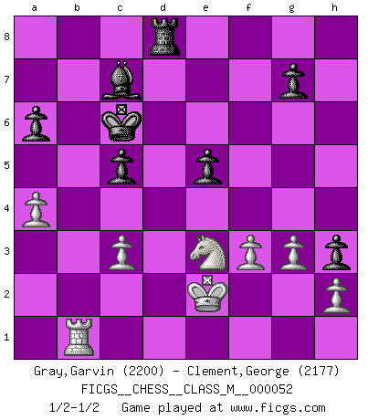 Last move : 1/2-1/2 2012 February 10 22:54:14 [Event "FICGS__CHESS__CLASS_M__000052"] [Site "FICGS"] [Date "2011.11.13"] [Round "1"] [White "Gray,Garvin"] [Black "Clement,George"] [Result "1/2-1/2"] [WhiteElo "2200"] [BlackElo "2177"] 1.d4 d5 2.c4 e6 3.g3 dxc4 4.Bg2 c5 5.Nf3 Nc6 6.Qa4 cxd4 7.Nxd4 Qxd4 8.Bxc6+ Bd7 9.Be3 Bxc6 10.Qxc6+ bxc6 11.Bxd4 Bb4+ 12.Kf1 Nf6 13.Kg2 O-O-O 14.e3 Bd6 15.Rc1 e5 16.Bc3 Nd5 17.Ba5 Nb6 18.Rc2 h5 19.Nd2 Bc7 20.Bb4 Nd5 21.Bc5 c3 22.bxc3 Nb6 23.Nb3 h4 24.a4 a6 25.Bxb6 Bxb6 26.Rb1 Rh6 27.Rcb2 c5 28.e4 Rd3 29.Nd2 Bc7 30.Rc1 Rh5 31.Nc4 f5 32.exf5 h3+ 33.Kf1 Rxf5 34.Rd2 Rxd2 35.Nxd2 Kb7 36.Rb1+ Kc6 37.Ke2 Rf8 38.f3 Rd8 39.Nc4 Rf8 40.Rb3 Rh8 41.Rb1 Rf8 42.Ke3 Kd5 43.Nd2 Rd8 44.Ke2 Kc6 45.Rb3 Kd6 46.Nc4+ Kd5 47.Ne3+ Kc6 48.Rb1 1/2-1/2 Queen's gambit declined Queenside Castling by player Black (move 13) This chess game ended in a draw. Follow this game move after move (download)You have to have the fighting spirit. You have to force moves and take chances. (Bobby Fischer) Die unerbitterlichsten Regeln im Schach sind die Ausnahmen. (Savielly Grigorievitsch Tartakower) No nos podemos resistir a la fascinación de un sacrificio ya que la pasión por los sacrificios es parte de la naturaleza de un jugador de Ajedrez. (Rudolf Spielman) Même si l'adversaire joue le coup analysé précédemment, recommencez l'analyse en voyant la nouvelle position. Première règle de Blumenfeld The beginning is the most important part of the work. (Plato)