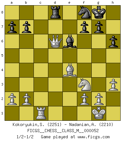 Last move : 1/2-1/2 2012 July 29 21:54:22 [Event "FICGS__CHESS__CLASS_M__000052"] [Site "FICGS"] [Date "2011.11.13"] [Round "1"] [White "Kokoryukin,Sergey"] [Black "Nadanian,Ashot"] [Result "1/2-1/2"] [WhiteElo "2251"] [BlackElo "2210"] 1.d4 d5 2.c4 e6 3.Nc3 Be7 4.Nf3 Nf6 5.Bg5 h6 6.Bxf6 Bxf6 7.e3 O-O 8.Rc1 c6 9.h3 Nd7 10.cxd5 exd5 11.Bd3 Re8 12.O-O Be7 13.Re1 Bd6 14.e4 dxe4 15.Nxe4 Nf8 16.Qb3 Re7 17.Nxd6 Qxd6 18.Rxe7 Qxe7 19.d5 cxd5 20.Qxd5 Be6 21.Qe5 Rd8 22.Be4 Qd6 23.Qxd6 1/2-1/2 QGD : Charousek (Petrosian) variation Kingside Castling by player Black (move 7) Kingside Castling by player White (move 12) This chess game ended in a draw. Follow this game move after move (download)Alekhine is a poet who creates a work of art out of something that would hardly inspire another man to send home a picture post card. (Max Euwe) Bobby Fischer ist kein Vorbild für die heutige Jugend. (Viktor Kortschnoi) El Ajedrez demanda una total concentración. (Bobby Fischer) Tout change constamment, y compris dans le monde des Echecs. (Botvinnik) There is no instance of a country having benefited from prolonged warfare. (Sun Tzu)