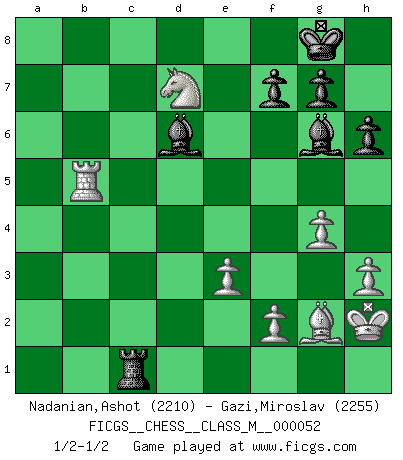 Last move : 1/2-1/2 2012 October 9 9:59:30 [Event "FICGS__CHESS__CLASS_M__000052"] [Site "FICGS"] [Date "2011.11.13"] [Round "1"] [White "Nadanian,Ashot"] [Black "Gazi,Miroslav"] [Result "1/2-1/2"] [WhiteElo "2210"] [BlackElo "2255"] 1.d4 Nf6 2.c4 e6 3.g3 d5 4.Bg2 Be7 5.Nf3 O-O 6.O-O dxc4 7.Qc2 a6 8.a4 Bd7 9.Qxc4 Bc6 10.Bg5 Bd5 11.Qc2 Be4 12.Qd1 h6 13.Bxf6 Bxf6 14.Nbd2 Bh7 15.Rc1 Nd7 16.Qb3 Rb8 17.Rfd1 c6 18.e3 Qb6 19.Qa3 Rfe8 20.Nc4 Qc7 21.b4 Nb6 22.Qb3 Nxc4 23.Qxc4 Rec8 24.Nd2 Bf5 25.b5 Bg4 26.Re1 axb5 27.axb5 Qa5 28.bxc6 bxc6 29.Nb3 Qh5 30.Qa6 Qb5 31.Nc5 e5 32.Qxb5 cxb5 33.h3 Bf5 34.g4 Bg6 35.dxe5 Bxe5 36.Nd7 Rxc1 37.Rxc1 Bb2 38.Rc5 Ba3 39.Rd5 Rc8 40.Rxb5 Rc1+ 41.Kh2 Bd6+ 1/2-1/2 Catalan : Closed, 5.Nf3 Kingside Castling by player Black (move 5) Kingside Castling by player White (move 6) This chess game ended in a draw. Follow this game move after move (download)I love all positions. Give me a difficult positional game, I will play it. But totally won positions, I cannot stand them. (Hein Donner) Ich trinke, ich rauche, ich spiele, ich liebe Frauen aber Fernschach ist ein Laster, das ich nicht habe. (Mikhail Nekhemyevich Tal) ¿Quién es tu oponente esta tarde? Esta tarde mi oponente son las piezas negras. (Akiba Rubinstein) D'abord les bases : Jouez et étudiez, puis étudiez et jouez, ensuite jouez et étudiez, puis étudiez et jouez. Deuxièmement : Donnez toujours le meilleur de vous-même ! (Ken Smith) If computers get too powerful, we can organize them into committees. That'll do them in. (Anonymous)