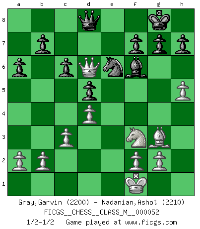 Last move : 1/2-1/2 2011 December 7 10:22:24 [Event "FICGS__CHESS__CLASS_M__000052"] [Site "FICGS"] [Date "2011.11.13"] [Round "1"] [White "Gray,Garvin"] [Black "Nadanian,Ashot"] [Result "1/2-1/2"] [WhiteElo "2200"] [BlackElo "2210"] 1.e4 e5 2.Nf3 Nc6 3.Bb5 Nf6 4.O-O Nxe4 5.Re1 Nd6 6.Nxe5 Be7 7.Bf1 Nxe5 8.Rxe5 O-O 9.d4 Bf6 10.Re1 Re8 11.c3 Rxe1 12.Qxe1 Nf5 13.Bd3 d5 14.Bf4 Ne7 15.Nd2 Bf5 16.Qe2 Bxd3 17.Qxd3 Ng6 18.Bg3 Qe7 19.Nf3 Re8 20.h3 c6 21.Re1 Qd7 22.Rxe8+ Qxe8 23.Qf5 Nf8 24.h4 a6 25.h5 Qd7 26.Qf4 Qd8 27.Kf1 Ne6 28.Qd6 1/2-1/2 Ruy Lopez : Berlin defense, Open variation Kingside Castling by player White (move 4) Kingside Castling by player Black (move 8) This chess game ended in a draw. Follow this game move after move (download)The Chess pieces are the block alphabet which shapes thoughts; and these thoughts, although making a visual design on the chessboard, express their beauty abstractly, like a poem. (Marcel Duchamp) Ich moechte nie einem Club beitreten, der Leute wie mich als Mitglieder aufnimmt. (Woody Allen) No nos podemos resistir a la fascinación de un sacrificio ya que la pasión por los sacrificios es parte de la naturaleza de un jugador de Ajedrez. (Rudolf Spielman) Les échecs, c'est la lutte contre l'erreur. (Johannes Zukertort) The smarter you play, the luckier you'll be. (Mark Pilarski)