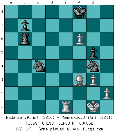 Last move : 1/2-1/2 2011 December 26 12:54:51 [Event "FICGS__CHESS__CLASS_M__000052"] [Site "FICGS"] [Date "2011.11.13"] [Round "1"] [White "Nadanian,Ashot"] [Black "Mamrukov,Dmitri"] [Result "1/2-1/2"] [WhiteElo "2210"] [BlackElo "2211"] 1.d4 Nf6 2.c4 e6 3.g3 d5 4.Bg2 Be7 5.Nf3 O-O 6.O-O dxc4 7.Qc2 a6 8.a4 Bd7 9.Qxc4 Bc6 10.Bg5 Bd5 11.Qc2 Be4 12.Qd1 c5 13.dxc5 Nbd7 14.Nc3 Nxc5 15.b4 Ncd7 16.Rc1 Bc6 17.b5 axb5 18.axb5 Bd5 19.Qd4 h6 20.Nxd5 Nxd5 21.Bxe7 Qxe7 22.e4 N5f6 23.e5 Nd5 24.Nd2 N7b6 25.Ne4 Ra4 26.Qd2 Nc4 27.Qe2 Qb4 28.Rfd1 Ncb6 29.Rb1 Qa5 30.Qe1 Qxe1+ 31.Rxe1 Rc8 32.Nd6 Rc7 33.f4 g6 34.Rec1 Rb4 35.Kf2 Rxc1 36.Rxc1 g5 37.f5 exf5 38.Nxf5 Rxb5 39.Nxh6+ Kf8 40.Kg1 Rb2 41.Bf3 Rb5 42.Re1 Nc4 43.Bh5 f6 44.Be2 Rb4 45.Bf3 Nde3 46.exf6 Rb6 47.Ng4 Nxg4 1/2-1/2 Catalan : Closed, 5.Nf3 Kingside Castling by player Black (move 5) Kingside Castling by player White (move 6) This chess game ended in a draw. Follow this game move after move (download)My God, Bobby Fischer plays so simply. (Alexei Suetin) Offensichtlich kennt Kasparow nichts anderes als Schach, und ich könnte 500 weitere Spieler dieser Sorte benennen. (Judith Polgar) Un Peón pasado es un criminal, quién debe ser mantenido bajo candado y llave. Leves medidas, tales como vigilancia policiaca, no son suficientes. (Aaron Nimzovich) Ce qui caractérise les parties de combat, c'est que si le défenseur a constamment de difficiles problèmes à résoudre, l'attaquant doit chercher sans relâche de nouvelles possibilités d'attaque. (Koblentz) Gambling is the son of avarice and the father of despair. (French proverb)