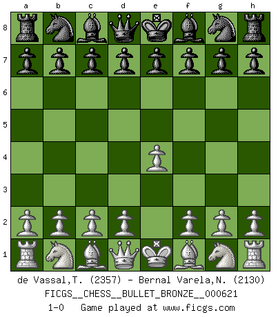 Last move : 1-0 2011 November 14 0:44:40 [Event "FICGS__CHESS__BULLET_BRONZE__000621"] [Site "FICGS"] [Date "2011.11.13"] [Round "1"] [White "de Vassal,Thibault"] [Black "Bernal Varela,Nelson"] [Result "1-0"] [WhiteElo "2357"] [BlackElo "2130"] 1.e4 1-0 This chess game has been lost on time (started : 2011.11.13 21:39:29) King's pawn Opening Player White won this chess game. Follow this game move after move (download)The tactician knows what to do when there is something to do; whereas the strategian knows what to do when there is nothing to do. (Gerald Abrahams) Verschiedene, sehr schätzbare und im Laufe des Lebens nützliche Eigenschaften des Geistes können durch das Schachspiel erworben und gekräftigt werden, so dass sie zu Gewohnheiten werden, die uns nie im Stich lassen. (Benjamin Franklin) Nos gusta pensar. (Gary Kasparov) Toutes choses étant égales, c'est la conviction qui gagne. Alliée à une volonté de vaincre, elle sert de détonateur, suscite des idées, disperse les doutes et aide à penser clairement. (Robert Fischer) You lose, general Kenobi. (General Grievous in Star Wars ep.3)
