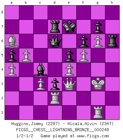 Last move : 1/2-1/2 2011 November 16 21:8:19 [Event "FICGS__CHESS__LIGHTNING_BRONZE__000248"] [Site "FICGS"] [Date "2011.11.16"] [Round "1"] [White "Huggins,Jimmy"] [Black "Alcala,Alvin"] [Result "1/2-1/2"] [WhiteElo "2287"] [BlackElo "2347"] 1.e4 c5 2.Nc3 d6 3.Nf3 Nf6 4.d4 cxd4 5.Nxd4 a6 6.g3 e5 7.Nb3 Be7 8.Bg2 Nbd7 9.a4 b6 10.Nd2 Nc5 11.Nc4 Be6 12.Ne3 Rc8 13.O-O O-O 14.Qd2 Qc7 15.Rd1 Rfe8 16.f3 h6 17.Bf1 Red8 18.Ncd5 Nxd5 19.Nxd5 Qa7 20.Nxe7+ Qxe7 21.b4 d5 22.Qf2 Nb7 23.Bxa6 d4 24.f4 Bc4 25.b5 f6 26.Ba3 Qc7 27.Bb4 Ra8 28.c3 d3 29.Qe3 Rab8 30.f5 Rd7 31.Rd2 Na5 32.Bxa5 bxa5 33.Kg2 Qd6 34.Kf3 Kf8 35.g4 Ke8 36.h4 Kf7 37.g5 hxg5 38.hxg5 Rh8 39.g6+ Ke7 40.Kg3 Rh5 41.Rg1 Rh6 1/2-1/2 Sicilian : Closed Kingside Castling by player White (move 13) Kingside Castling by player Black (move 13) This chess game ended in a draw. Follow this game move after move (download)A bad plan is better than none at all. (Frank Marshall) Wie bekannt hörte Morphy 1859 auf, Schach zu spielen. Seine Enttäuschung galt nicht so sehr dem Schach, wie den Schachspielern. (Robert James Fischer) Hoy en día, si tu no eres un Gran Maestro a los 14 años, es mejor que lo olvides. (Anand Viswanathan) La vérité est comme le meilleur coup aux échecs : elle existe, mais il faut la chercher. (Arturo Perez-Reverte) Philosophers use a language that is already deformed as though by shoes that are too tight. (Ludwig Wittgenstein)