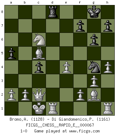 Last move : 1-0 2011 December 3 7:58:13 [Event "FICGS__CHESS__RAPID_E__000067"] [Site "FICGS"] [Date "2011.11.17"] [Round "1"] [White "Bromo,Alexis"] [Black "Di Giandomenico,Pierino"] [Result "1-0"] [WhiteElo "1128"] [BlackElo "1161"] 1.d4 d5 2.c4 Be6 3.Nc3 c6 4.Nf3 dxc4 5.e3 Nd7 6.Bd2 Nb6 7.Qc2 Rc8 8.g3 g6 9.O-O-O Nf6 10.Bg2 Bh6 11.e4 O-O 12.Bxh6 Re8 13.h4 Ng4 14.Bg5 Na4 15.Nxa4 b5 16.Nc5 b4 17.Nxe6 Qd6 18.Nc5 Red8 19.Nb7 Rd7 20.Nxd6 Rxd6 21.Bxe7 Rd7 22.Bxb4 Rcd8 23.Bc5 Rxd4 24.Nxd4 a5 25.Nxc6 1-0 Queen's Gambit Queenside Castling by player White (move 9) Kingside Castling by player Black (move 11) Player White won this chess game. Follow this game move after move (download)I have never in my life played the French Defence, which is the dullest of all openings. (Wilhelm Steinitz) Das typische an einem Großmeister ist, daß er eine gewonnene Position schnell und schmerzlos gewinnt. (Irving Chernev) Aquellos que dicen que entienden al Ajedrez, no entienden nada. (Robert Hubner) J'ai vu le vaincu d'Echecs jouer des années durant dans l'espoir de la fête de la victoire. Car tu es plus riche de ce qu'elle existe si même elle n'est point pour toi. Ainsi de la perle du fond des mers. (Antoine de Saint-Exupéry) In God we trust, all others we virus scan. (Anonymous)