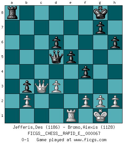 Last move : 0-1 2011 December 22 10:21:45 [Event "FICGS__CHESS__RAPID_E__000067"] [Site "FICGS"] [Date "2011.11.17"] [Round "1"] [White "Jefferis,Des"] [Black "Bromo,Alexis"] [Result "0-1"] [WhiteElo "1186"] [BlackElo "1128"] 1.e4 e5 2.Nf3 Nc6 3.Bc4 h6 4.d3 Nf6 5.Nc3 Bb4 6.Bd2 a6 7.Nd5 Nxd5 8.exd5 Bxd2+ 9.Nxd2 Nd4 10.c3 Nf5 11.O-O d6 12.Ne4 b5 13.Bb3 Bb7 14.Re1 O-O 15.c4 c5 16.cxb5 axb5 17.a3 Nd4 18.Ba2 f5 19.Nc3 b4 20.axb4 cxb4 21.Ne2 Qb6 22.Nxd4 Qxd4 23.Bc4 Bxd5 24.Bxd5+ Qxd5 25.Rxa8 Rxa8 26.Qd2 b3 27.Qc3 f4 0-1 King's pawn game Kingside Castling by player White (move 11) Kingside Castling by player Black (move 14) Player Black won this chess game. Follow this game move after move (download)Man is a frivolous, a specious creature, and like a Chess player, cares more for the process of attaining his goal than for the goal itself. (Dostoyevsky) Es ist wirklich schade, dass so viele Schachspieler nicht auf ihr Äußeres achten! (Alexandra Kosteniuk) El Ajedrez es un regaderazo frío para la mente. (Sir John Simon) Il vaut mieux sacrifier les pièces de l'adversaire. (Xavier Tartacover) Coffee just isn't my cup of tea. (Unknown)