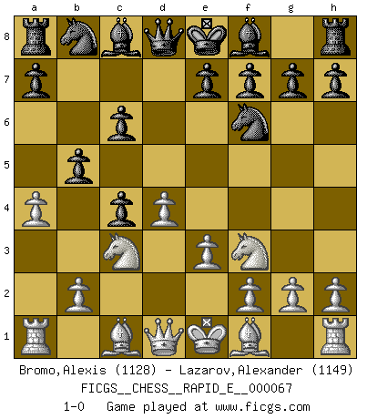 Last move : 1-0 2011 December 24 17:12:52 [Event "FICGS__CHESS__RAPID_E__000067"] [Site "FICGS"] [Date "2011.11.17"] [Round "1"] [White "Bromo,Alexis"] [Black "Lazarov,Alexander"] [Result "1-0"] [WhiteElo "1128"] [BlackElo "1149"] 1.d4 d5 2.c4 dxc4 3.Nc3 c6 4.e3 b5 5.Nf3 Nf6 6.a4 1-0 This chess game has been lost on time (started : 2011.11.17 9:17:21) Queen's gambit accepted Player White won this chess game. Follow this game move after move (download)Daring ideas are like Chess men moved forward. They may be beaten, but they may start a winning game. (Johann Wolfgang von Goethe) Schach ist Krieg, im Schach geht es um testosterongesteuerte Urschreie. (Garry Kasparov) El Ajedrez es parte de la cultura, y si una cultura esta en decadencia, entonces también el Ajedrez declinará. (Mikhail Botvinnik) Soyez une menace à chaque fois que vous vous asseyez pour jouer. (Ken Smith) Work expands to fill the time available. (C. Northcote Parkinson, in Parkinson's Laws)