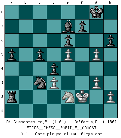 Last move : 0-1 2011 December 24 13:22:37 [Event "FICGS__CHESS__RAPID_E__000067"] [Site "FICGS"] [Date "2011.11.17"] [Round "1"] [White "Di Giandomenico,Pierino"] [Black "Jefferis,Des"] [Result "0-1"] [WhiteElo "1161"] [BlackElo "1186"] 1.d4 Nf6 2.e3 e6 3.Bd3 d5 4.Nh3 Be7 5.O-O O-O 6.Nc3 b6 7.b3 Nc6 8.Nf4 Bb7 9.Bb2 a5 10.a4 Nb4 11.Qe2 c5 12.dxc5 bxc5 13.e4 d4 14.Nb5 Nxd3 15.cxd3 Ba6 16.Na3 Rb8 17.Qc2 g5 18.Ne2 h6 19.Rac1 Qb6 20.Nc4 Bxc4 21.Qxc4 Qxb3 22.Qxb3 Rxb3 23.Rb1 Rfb8 24.Ba1 Rxb1 25.f3 Rxf1+ 26.Kxf1 Rb1+ 27.Kf2 Rxa1 28.f4 Rxa4 29.e5 Nd5 30.g3 Ra2 31.fxg5 Nc3 0-1 Queen's pawn game Kingside Castling by player White (move 5) Kingside Castling by player Black (move 5) Player Black won this chess game. Follow this game move after move (download)Fischer wanted to give the Russians a taste of their own medicine. (Larry Evans) Mit Schach schule ich mein Gefühl für Geometrie, was für Tennis und Schach gleichermaßen wichtig ist. (Boris Becker) Nos gusta pensar. (Gary Kasparov) Les échecs sont utiles à l'exercice de la faculté de penser et à celle de l'imagination. Car nous devons posséder une méthode élaborée pour atteindre des buts partout où nous devons conduire notre raison. (Leibnitz) Always be a first-rate version of yourself, instead of a second-rate version of somebody else. (Judy Garland)
