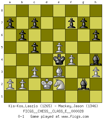 Last move : 0-1 2007 May 1 7:6:44 [Event "FICGS__CHESS__CLASS_E__000028"] [Site "FICGS"] [Date "2007.01.07"] [Round "1"] [White "Kis-Kos,Laszlo"] [Black "Mackey,Jason"] [Result "0-1"] [WhiteElo "1265"] [BlackElo "1346"] 1.e4 e5 2.Nf3 Nc6 3.Bb5 Nf6 4.O-O Nxe4 5.d4 Nd6 6.Bxc6 dxc6 7.dxe5 Nf5 8.Qxd8+ Kxd8 9.Nc3 h6 10.Bd2 Be6 11.Ne2 Be7 12.Rfd1 Kc8 13.Ned4 Nxd4 14.Nxd4 Bd7 15.Be3 Rd8 16.Rd3 b6 17.Rad1 Kb7 18.Nf3 Bf5 19.Rxd8 Rxd8 20.Rxd8 Bxd8 21.Nd4 Bc8 22.Kf1 c5 23.Nb3 Bf5 24.c3 Kc6 25.Ke2 Kd5 26.f4 Bg4+ 27.Kf2 Ke4 28.h3 Be6 29.Ke2 Bc4+ 30.Kd2 Bh4 31.Nc1 Bf1 32.Ne2 Bxg2 0-1 Ruy Lopez : Berlin defense, Open variation Kingside Castling by player White (move 4) Player Black won this chess game. Follow this game move after move (download)There just isn't enough televised Chess. (David Letterman) Deine Wertungszahl - vorausgesetzt einige Jahre schachliche Anstrengung - entspricht etwa dem zehnfachen Deines IQ plus 1000. (Jonathan Levitt) El Ajedrez no es como la vida... ¡tiene reglas!. (Mark Pasternak) Si le désir cupide (et stupide) de gagner est une inépuisable source de souffrance, une combinaison brillante sur l'échiquier est une découverte : le coquelicot qui s'épanouit lorsque apparaît la Voie Lactée. (Arrabal) There is no vagueness without wind. (Chinese proverb)
