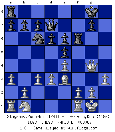 Last move : 1-0 2011 December 18 11:28:27 [Event "FICGS__CHESS__RAPID_E__000067"] [Site "FICGS"] [Date "2011.11.17"] [Round "1"] [White "Stoyanov,Zdravko"] [Black "Jefferis,Des"] [Result "1-0"] [WhiteElo "1281"] [BlackElo "1186"] 1.e4 e5 2.Nf3 d6 3.h3 Be7 4.a3 Nf6 5.c3 O-O 6.d3 Nc6 7.Be2 Be6 8.Ng5 Nd7 9.Nxe6 fxe6 10.Bg4 Bg5 11.Bxg5 Qe8 12.Be3 Nf6 13.Bg5 Qd7 14.O-O Nxg4 15.Qxg4 h6 16.Bxh6 Rf6 17.Be3 1-0 Philidor's defense Kingside Castling by player Black (move 5) Kingside Castling by player White (move 14) Player White won this chess game. Follow this game move after move (download)Castle early and often. (Rob Sillars) Ich bewundere Kasparows phantasievolle Angriffssiege aus den Achtzigern und Neunzigern, aber wenn man sie mit dem Computer überprüft, nimmt der Computer in jeder zweiten Partie die Opfer an, verteidigt sich und gewinnt. (Vladimir Kramnik) Bobby Fischer es el mas grande genio de Ajedrez de todos los tiempos. (Alexander Kotov) Les Echecs sont et restent toujours un combat, un combat intégral comme la boxe, la lutte ou un autre sport, et où il doit y avoir un vainqueur et un vaincu. (Joseph Emil Diemer) A clear conscience is usually the sign of a bad memory. (Unknown)