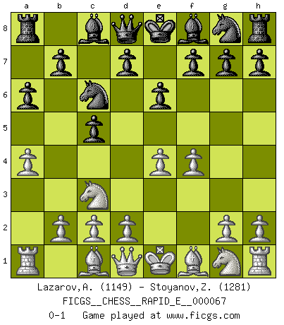 Last move : 0-1 2011 December 31 5:34:34 [Event "FICGS__CHESS__RAPID_E__000067"] [Site "FICGS"] [Date "2011.11.17"] [Round "1"] [White "Lazarov,Alexander"] [Black "Stoyanov,Zdravko"] [Result "0-1"] [WhiteElo "1149"] [BlackElo "1281"] 1.e4 c5 2.Nc3 a6 3.a4 Nc6 4.f4 e6 0-1 This chess game has been lost on time (started : 2011.11.17 9:17:21) Sicilian : Closed Player Black won this chess game. Follow this game move after move (download)There are two classes of men; those who are content to yield to circumstances and who play whist; those who aim to control circumstances, and who play Chess. (Mortimer Collins) Woher wissen wir, daß der Neanderthaler Blindschach gespielt hat? -- Bei Ausgrabungen wurden keine Schachbretter und Figuren gefunden. (Anonymous) Botvinnik trataba de restarle el misterio al Ajedrez, siempre relacionandolo a situaciones de la vida ordinaria. El gustaba de llamar al Ajedrez un típico problema inexacto similar a aquellos de los cuales la gente siempre tiene que enfrentarse en la vida cotidiana. (Garry Kasparov) Les Echecs, c'est l'art de la guerre sans les charniers, c'est la résurrection des morts tombés au champ d'honneur, l'espoir perpétuel, la suprématie de l'intelligence sur la force, la culture de l'esprit. (F. Szpiner) Lamb in skin of tiger, still fears the wolf. (Chinese proverb)