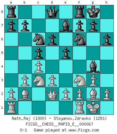 Last move : 0-1 2011 December 30 5:32:19 [Event "FICGS__CHESS__RAPID_E__000067"] [Site "FICGS"] [Date "2011.11.17"] [Round "1"] [White "Nath,Raj"] [Black "Stoyanov,Zdravko"] [Result "0-1"] [WhiteElo "1300"] [BlackElo "1281"] 1.c4 c5 2.Nc3 Nc6 3.Nf3 e6 4.g3 h6 5.Bg2 Nf6 6.b3 Be7 7.O-O O-O 8.Bb2 e5 9.d3 d6 10.Qd2 Bg4 0-1 This chess game has been lost on time (started : 2011.11.17 9:17:21) English : Symmetrical variation Kingside Castling by player White (move 7) Kingside Castling by player Black (move 7) Player Black won this chess game. Follow this game move after move (download)Chess is a matter of delicate judgment, knowing when to punch and how to duck. (Bobby Fischer) Ein Gewinn durch eine ungenaue Kombination, sei sie auch noch so vorzeigbar, erfüllt mich mit Schaudern. (Wilhelm Steinitz) No hay otro maestro que tenga una voluntad terrífica de ganar. Al tablero, el irradía peligro y aún los oponentes mas fuertes tienden a congelarse como liebres cuando olfatean a una pantera. Aún sus debilidades son peligrosas. Con las blancas, su juego de apertura es predecible - te es posible hacer planes en su contra - pero es tan fuerte que tus planes casi nunca funcionan. En el juego medio, su precisión e invención son fabulosas y en finales, tú simplemente no le puedes vencer. (Experto Alemán anónimo) La vérité est comme le meilleur coup aux échecs : elle existe, mais il faut la chercher. (Arturo Perez-Reverte) The good fighters of old first put themselves beyond the possibility of defeat, and then waited for an opportunity of defeating the enemy. (Sun Tzu)