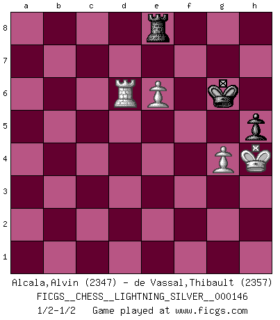 Last move : 1/2-1/2 2011 November 17 21:57:31 [Event "FICGS__CHESS__LIGHTNING_SILVER__000146"] [Site "FICGS"] [Date "2011.11.17"] [Round "1"] [White "Alcala,Alvin"] [Black "de Vassal,Thibault"] [Result "1/2-1/2"] [WhiteElo "2347"] [BlackElo "2357"] 1.e4 e5 2.Nf3 Nc6 3.Bb5 a6 4.Ba4 Nf6 5.O-O Be7 6.Re1 b5 7.Bb3 d6 8.c3 O-O 9.h3 Bb7 10.d4 Re8 11.Nbd2 Bf8 12.a4 h6 13.Bc2 exd4 14.cxd4 Nb4 15.Bb1 c5 16.d5 Nd7 17.Ra3 c4 18.axb5 axb5 19.Nd4 Rxa3 20.bxa3 Nd3 21.Bxd3 cxd3 22.Bb2 Qa5 23.Re3 Nc5 24.Nf5 g6 25.Ng3 Bg7 26.Bxg7 Kxg7 27.Nb3 Qxa3 28.Nxc5 dxc5 29.Rxd3 Qa7 30.Qd2 f6 31.h4 Bc8 32.Qe3 Qc7 33.h5 g5 34.Rc3 c4 35.Ra3 Kg8 36.Ra8 c3 37.Ra7 Qc4 38.d6 Qc6 39.e5 c2 40.Rc7 c1Q+ 41.Qxc1 Qxc1+ 42.Rxc1 fxe5 43.f3 Rd8 44.Rc5 b4 45.Rxe5 Bd7 46.Re1 Kf8 47.Ne4 Bc6 48.Kf2 Kf7 49.Rd1 Bxe4 50.fxe4 Ke6 51.Rd4 Ke5 52.Rxb4 Rxd6 53.Ke3 Ra6 54.Rb5+ Kf6 55.Kf3 Ra3+ 56.Kg4 Ra6 57.Rd5 Ke6 58.Rc5 Rb6 59.Rc8 Kf6 60.g3 Rd6 61.Rf8+ Kg7 62.Rf2 Re6 63.Kf3 Re5 64.Rf1 g4+ 65.Kf4 Rxh5 66.Kxg4 Rb5 67.Rd1 Kf6 68.Rd5 Rb8 69.Rd6+ Kg7 70.e5 Rf8 71.Rd7+ Kg6 72.Rd4 h5+ 73.Kh4 Re8 74.Rd6+ Kg7 75.e6 Kg6 76.g4 1/2-1/2 Ruy Lopez : Closed Kingside Castling by player White (move 5) Kingside Castling by player Black (move 8) Promotion Queen by player Black (move 40) 10 pieces endgame at move 52 : White KRPPPP , Black KRPP WHITE : King + 1 Rook 4 Pawns BLACK : King + 1 Rook 2 Pawns 9 pieces endgame at move 52 : White KRPPP , Black KRPP WHITE : King + 1 Rook 3 Pawns BLACK : King + 1 Rook 2 Pawns 8 pieces endgame at move 65 : White KRPP , Black KRPP WHITE : King + 1 Rook 2 Pawns BLACK : King + 1 Rook 2 Pawns 7 pieces endgame at move 66 : White KRPP , Black KRP WHITE : King + 1 Rook 2 Pawns BLACK : King + 1 Rook 1 Pawn This chess game ended in a draw. Follow this game move after move (download)Chess is ruthless: you've got to be prepared to kill people. (Nigel Short) Wenn du nicht weißt was du tun sollst, warte bis dein Gegner eine Idee hat. Sie wird sicher schlecht sein. (Siegbert Tarrasch) El Ajedrez es un invernadero donde los frutos del carácter pueden madurar mas completamente que en la vida. (Edward Morgan Foster) Même si vous avez un bon coup à faire, regardez toujours s'il n'y en a pas un qui lui soit préférable. (Pedro Damiano) . 'gn is not allowed in chess unless n is an integer between 1 and 8 inclusive, where 1 and 8 are to interpreted as the standard numerals standing for integers in the ordered real-closed field R, with the *canonical* ordering. (As opposed to, say, an integer in the domain Z[2+i*sqrt(5)] or an integer in some exotic Grothendieck topos). (Normajean Yates)