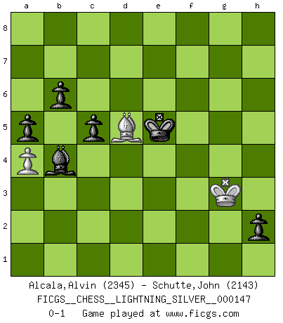 Last move : 0-1 2011 November 18 18:38:26 [Event "FICGS__CHESS__LIGHTNING_SILVER__000147"] [Site "FICGS"] [Date "2011.11.18"] [Round "1"] [White "Alcala,Alvin"] [Black "Schutte,John"] [Result "0-1"] [WhiteElo "2345"] [BlackElo "2143"] 1.e4 c5 2.Nf3 d6 3.d4 cxd4 4.Nxd4 Nf6 5.Nc3 a6 6.Be2 e5 7.Nb3 Be7 8.Qd3 O-O 9.O-O Be6 10.Nd5 Nxd5 11.exd5 Bc8 12.Be3 f5 13.f4 Nd7 14.fxe5 Nxe5 15.Qd2 Bf6 16.Rae1 Qc7 17.Nd4 g6 18.b3 Bd7 19.c4 Rae8 20.a4 b6 21.Nc2 a5 22.Bd4 Bh4 23.g3 Bf6 24.h4 h5 25.Ne3 Re7 26.Ng2 Be8 27.Nf4 Bf7 28.Kg2 Rfe8 29.Bd1 Qb7 30.Qf2 Rb8 31.Qg1 Qc7 32.Re2 Qb7 33.Rfe1 R7e8 34.Nh3 Kg7 35.Bc2 Re7 36.Ng5 Kg8 37.Qf2 Qc7 38.Qf4 Rbe8 39.Bg1 Bg7 40.Qd2 Qb7 41.Nh3 Bf6 42.Bf2 Bg7 43.Ng5 Qc7 44.Nh3 Qb8 45.Bd4 Nxc4 46.bxc4 Rxe2+ 47.Rxe2 Rxe2+ 48.Qxe2 Bxd4 49.Qe7 Qe8 50.Qxe8+ Bxe8 51.Ng5 Bf6 52.Kf3 Be5 53.Bb3 Kg7 54.Ne6+ Kf6 55.Nd8 Bc3 56.Nc6 Bd7 57.Bc2 Bd2 58.Nd4 Bb4 59.Nc6 Bc5 60.Bb1 Bc8 61.Bc2 Ba6 62.Bb3 Bb7 63.Nd8 Bc8 64.Nc6 Kf7 65.Na7 Bb7 66.Nc6 Ba6 67.Kf4 Bc8 68.Bc2 Kg7 69.Bd1 Kf6 70.Bc2 Bb7 71.Kf3 Ba3 72.Nd4 Bb4 73.Nc6 Bc5 74.Bd3 Ba6 75.Nd8 Bc8 76.Bc2 Bd7 77.Nc6 Ba3 78.Nd4 Bb2 79.Nc6 Bc1 80.Nd4 Ba3 81.Nc6 Bb2 82.Nb8 Be8 83.Nc6 Be5 84.Nd8 Bd7 85.Ne6 Bxe6 86.dxe6 Kxe6 87.Bb3 Kd7 88.c5 dxc5 89.Bc4 Ke7 90.Bb3 Kf6 91.Bc4 g5 92.hxg5+ Kxg5 93.Be6 f4 94.gxf4+ Bxf4 95.Ke4 h4 96.Kd5 Bd2 97.Ke5 Bb4 98.Ke4 Kf6 99.Bd5 h3 100.Kf4 h2 101.Kg3 Ke5 0-1 This chess game has been lost on time (started : 2011.11.18 16:13:57) Sicilian : Najdorf, Opovcensky variation Kingside Castling by player Black (move 8) Kingside Castling by player White (move 9) 10 pieces endgame at move 94 : White KBPP , Black KBPPPP WHITE : King + 1 Bishop 2 Pawns BLACK : King + 1 Bishop 4 Pawns 9 pieces endgame at move 94 : White KBP , Black KBPPPP WHITE : King + 1 Bishop 1 Pawn BLACK : King + 1 Bishop 4 Pawns Player Black won this chess game. Follow this game move after move (download)In complicated positions, Bobby Fischer hardly had to be afraid of anybody. (Paul Keres) Viele Opfer benötigen überhaupt keine konkrete Berechnung. Es genügt sich die entstehende Position kurz vorzustellen, um uns davon zu überzeugen, dass das Opfer korrekt ist. (Mikhail Nekhemyevich Tal) El Ajedrez es un juego de pelea el cual es puramente intelectual e incluye la suerte. (Richard Reti) Demandez au pauvre Cg1 ce qu'il en pense. Eduard Gufeld à propos de la variante Saemisch de l'Est-Indienne. At work, the authority of a person is inversely proportional to the number of pens that person is carrying. (Dan Rotaru)