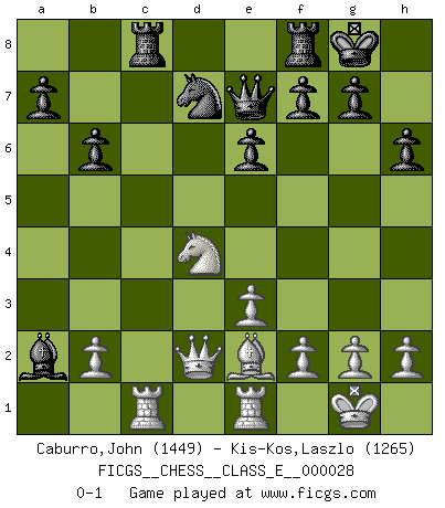Last move : 0-1 2007 April 26 0:45:31 [Event "FICGS__CHESS__CLASS_E__000028"] [Site "FICGS"] [Date "2007.01.07"] [Round "1"] [White "Caburro,John"] [Black "Kis-Kos,Laszlo"] [Result "0-1"] [WhiteElo "1449"] [BlackElo "1265"] 1.d4 d5 2.c4 e6 3.Nf3 Nf6 4.Bg5 Be7 5.e3 O-O 6.Nc3 h6 7.Bh4 b6 8.Rc1 Bb7 9.cxd5 Nxd5 10.Bxe7 Qxe7 11.Be2 Nd7 12.O-O c5 13.Re1 Rac8 14.Qd2 cxd4 15.Nxd5 Bxd5 16.Nxd4 Bxa2 0-1 QGD Kingside Castling by player Black (move 5) Kingside Castling by player White (move 12) Player Black won this chess game. Follow this game move after move (download)Let the perfectionist play postal. (Yasser Seirawan) Weshalb minderdergeübte Spieler mit g2-g4 beginnen? Die betreffenden sind unschlüssig, ob sie nun rechts (h4) oder links (f4) beginnen sollen, und in ihrer Ratlosigkeit entschliessen sie sich nach guter Bürgerart dazu, den goldenen Mittelweg zu wählen. (Aaron Nimzowitsch) El Ajedrez es sobre todo, ¡una pelea!. (Emanuel Lasker) L'action d'une oeuvre littéraire se déroule sur un champ de bataille. Les masques et les types du drame moderne correspondent aux pièces du jeu d'échecs. L'intrigue correspond aux coups et aux gambits, c'est à dire aux techniques du jeu telles qu'utilisées et interprétées par les joueurs. Les tactiques et les péripéties [mouvements] correspondent aux coups exécutés par l'adversaire. (Viktor Shklovsky) Sometimes it pays to stay in bed in Monday, rather than spending the rest of the week debugging Monday's code. (Dan Salomon)